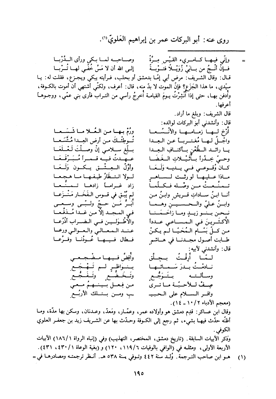 قال: وقال الشريف: مرض أبي إمّا بدمشق أو بحلب، فرأيته يبكي ويجزع، فقلت له: يا سيّدي، ما هذا الجزع؟ فإنّ الموت لا بدّ منه، قال: أعرف ولكنّي أشتهي أن أموت بالكوفة، وأدفن بها، حتى إذا أنشرت يوم القيامة أخرج رأسي من التراب فأرى بني عمّي، ووجوها أعرفها.