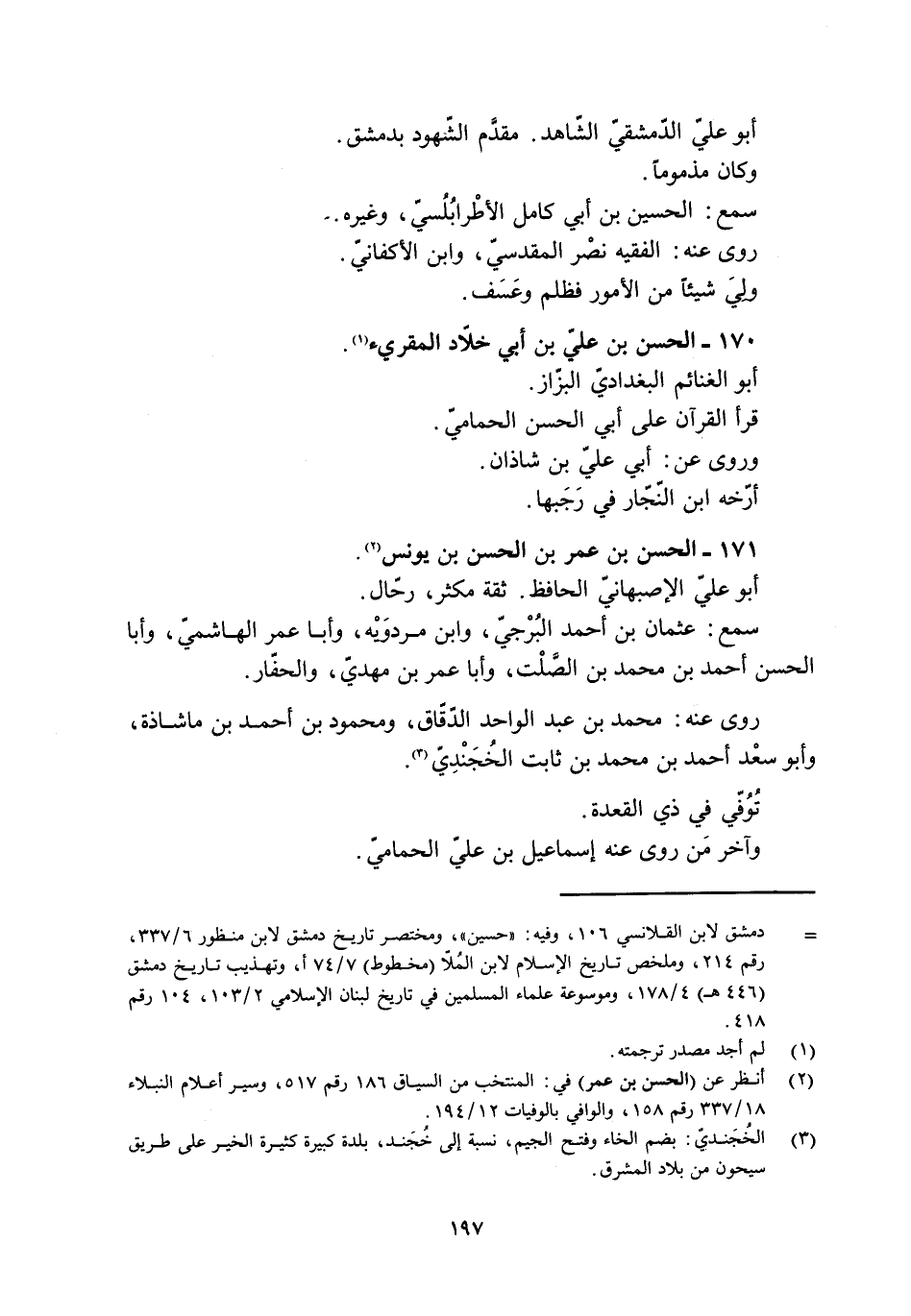 [ (-) ] دمشق لابن القلانسي 106، وفيه: «حسين» ، ومختصر تاريخ دمشق لابن منظور 6/ 337، رقم 214، وملخص تاريخ الإسلام لابن الملّا (مخطوط) 7/ 74 أ، وتهذيب تاريخ دمشق (446 هـ) 4/ 178، وموسوعة علماء المسلمين في تاريخ لبنان الإسلامي 2/ 103، 104 رقم 418.