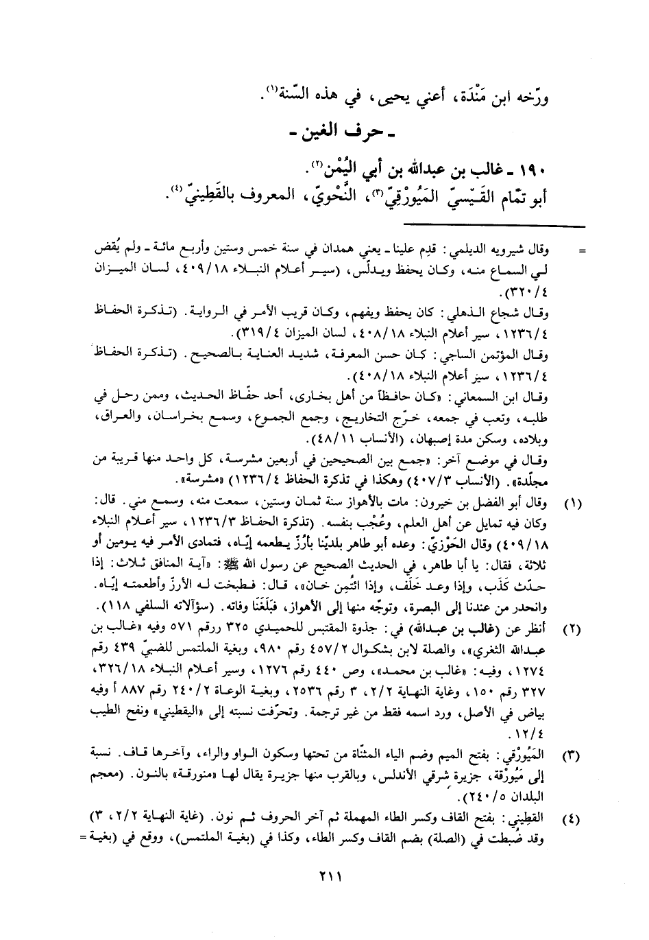 [4] القطيني: بفتح القاف وكسر الطاء المهملة ثم آخر الحروف ثم نون. (غاية النهاية 2/ 2، 3) وقد ضبطت في (الصلة) بضم القاف وكسر الطاء، وكذا في (بغية الملتمس) ، ووقع في (بغية