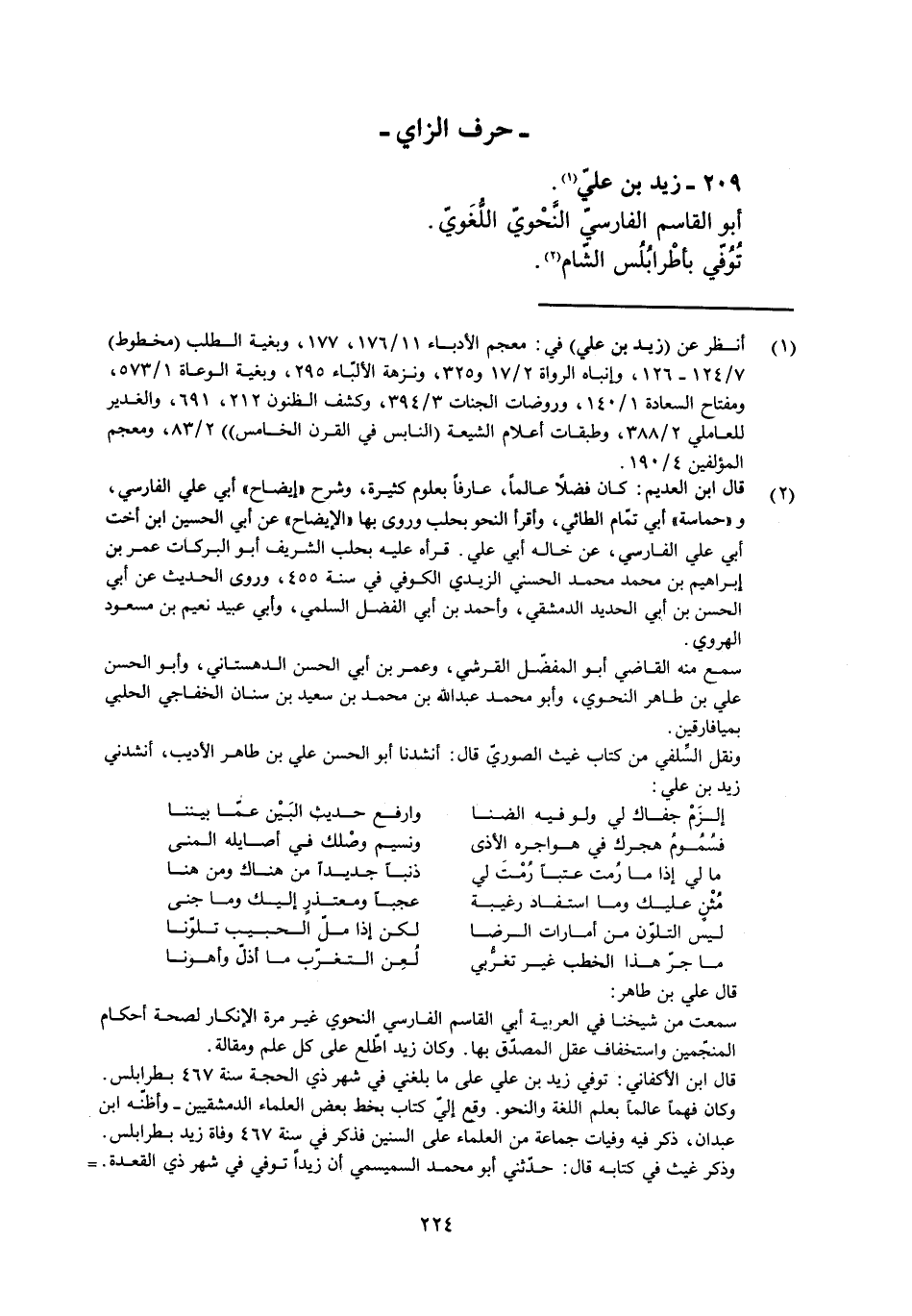 [1] انظر عن (زيد بن علي) في: معجم الأدباء 11/ 176، 177، وبغية الطلب (مخطوط) 7/ 124- 126، وإنباه الرواة 2/ 17 و 325، ونزهة الألبّاء 295، وبغية الوعاة 1/ 573، ومفتاح السعادة 1/ 140، وروضات الجنات 3/ 394، وكشف الظنون 212، 691، والغدير للعاملي 2/ 388، وطبقات أعلام الشيعة (النابس في القرن الخامس» 2/ 83، ومعجم المؤلفين 4/ 190.
