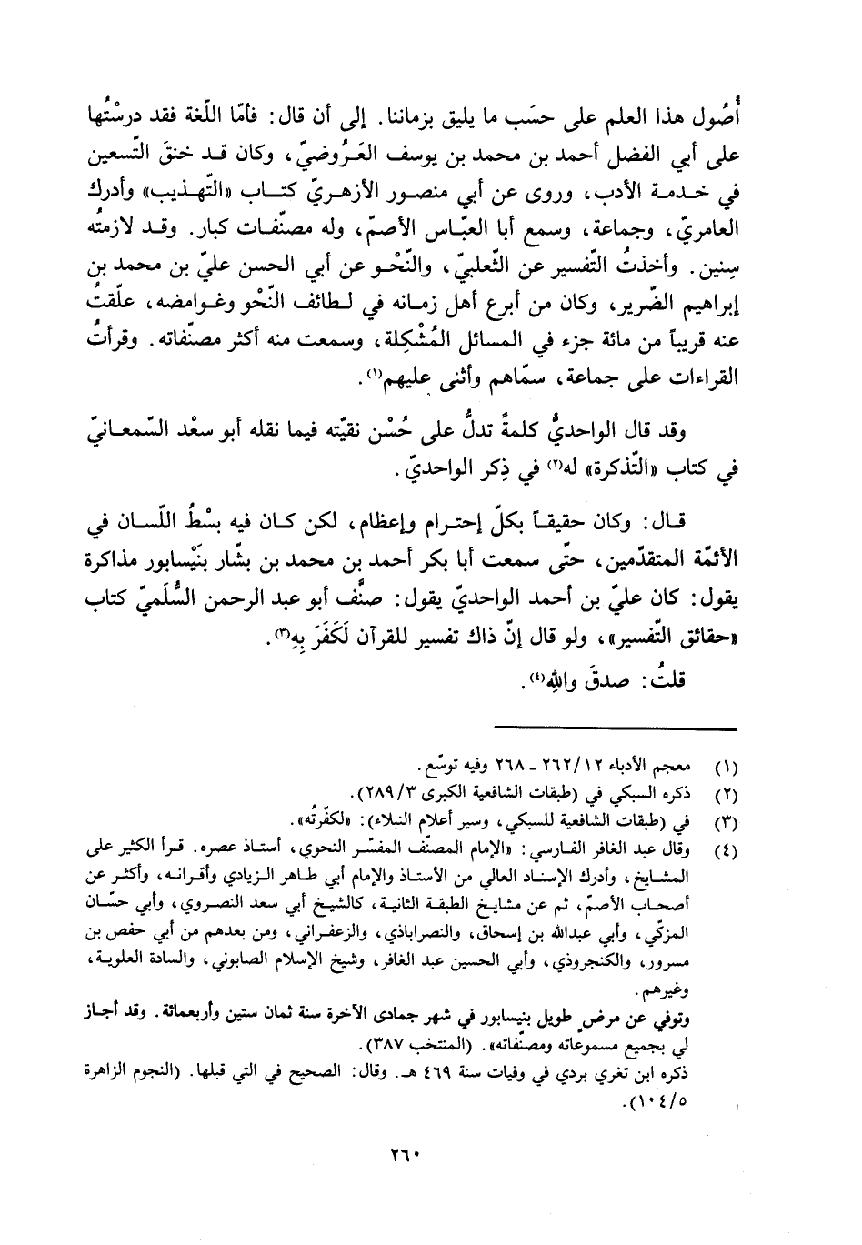 وقد قال الواحديُّ كلمةً تدلُّ على حُسْن نقيّته فيما نقله أبو سعْد السمعانيّ فِي كتاب «التذكرة» له [2] فِي ذِكر الواحديّ.