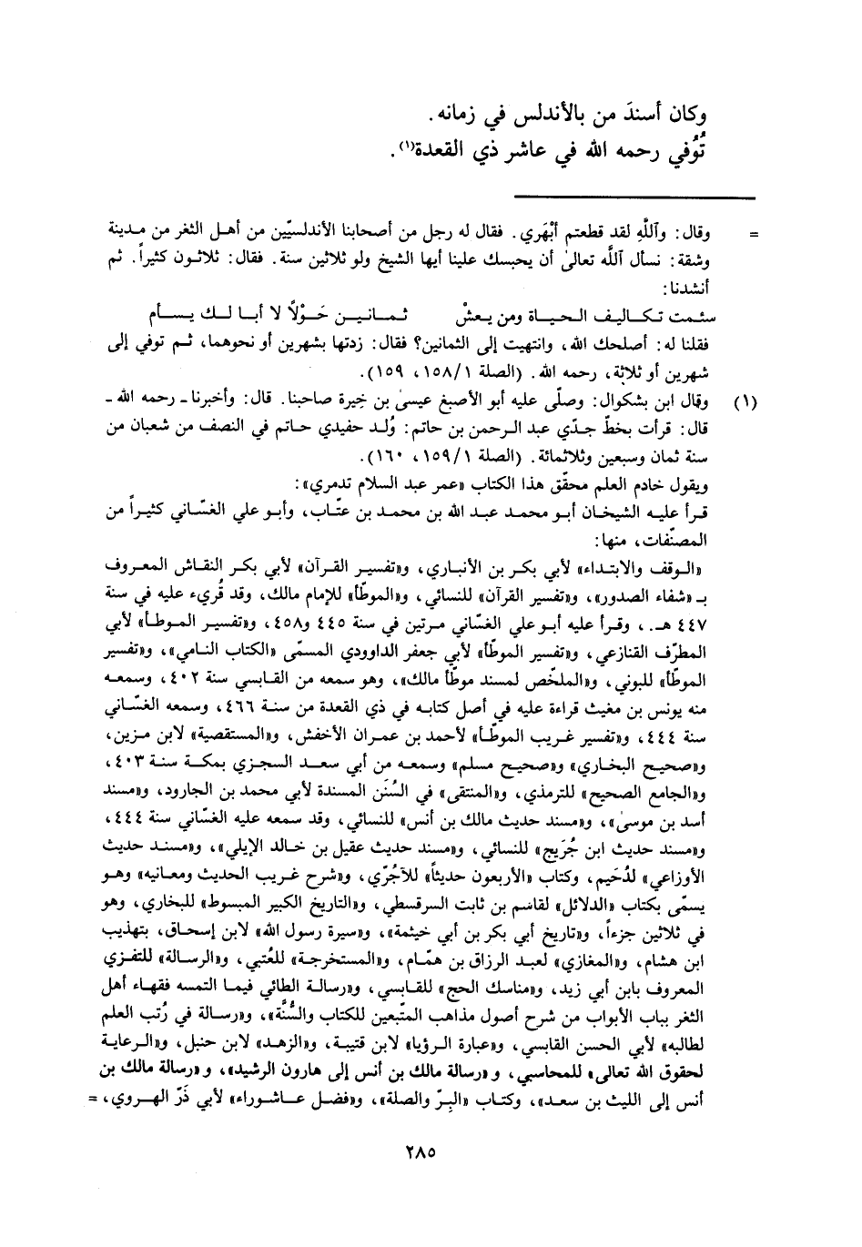 فقلنا له: أصلحك الله، وانتهيت إلى الثمانين؟ فقال: زدتها بشهرين أو نحوهما، ثم توفي إلى شهرين أو ثلاثة، رحمه الله. (الصلة 1/ 158، 159) .