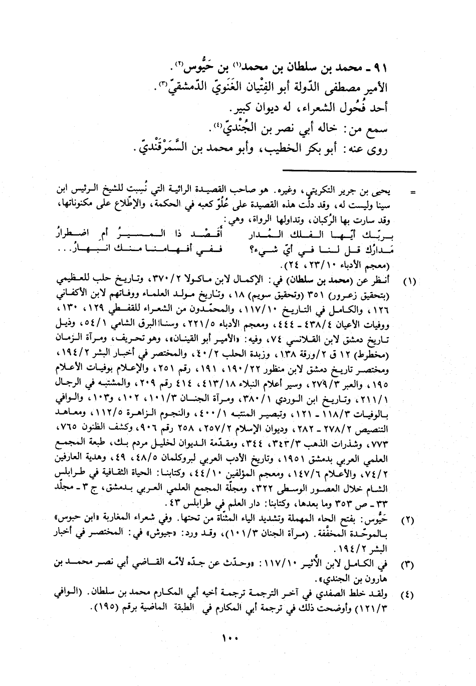 [1] انظر عن (محمد بن سلطان) في: الإكمال لابن ماكولا 2/ 370، وتاريخ حلب للعظيميّ (بتحقيق زعرور) 351 (وتحقيق سويم) 18، وتاريخ مولد العلماء ووفاتهم لابن الأكفاني 126، والكامل في التاريخ 10/ 117، والمحمدون من الشعراء للقفطي 129، 130، ووفيات الأعيان 4/ 438- 444، ومعجم الأدباء 5/ 221، وسنا البرق الشامي 1/ 54، وذيل تاريخ دمشق لابن القلانسي 74، وفيه: «الأمير أبو القينان» ، وهو تحريف، ومرآة الزمان (مخطوط) 12 ق 2/ ورقة 138، وزبدة الحلب 2/ 40، والمختصر في أخبار البشر 2/ 194، ومختصر تاريخ دمشق لابن منظور 22/ 190، 191، رقم 251، والإعلام بوفيات الأعلام 195، والعبر 3/ 279، وسير أعلام النبلاء 18/ 413، 414 رقم 209، والمشتبه في الرجال 1/ 211، وتاريخ ابن الوردي 1/ 380، ومرآة الجنان 3/ 101، 102، و 103، والوافي بالوفيات 3/ 118- 121، وتبصير المنتبه 1/ 400، والنجوم الزاهرة 5/ 112، ومعاهد التنصيص 2/ 278- 282، وديوان الإسلام 2/ 257، 258 رقم 906، وكشف الظنون 765، 773، وشذرات الذهب 3/ 343، 344، ومقدّمة الديوان لخليل مردم بك، طبعة المجمع العلمي العربيّ بدمشق 1951، وتاريخ الأدب العربيّ لبروكلمان 5/ 48، 49، وهدية العارفين 2/ 74، والأعلام 6/ 147، ومعجم المؤلفين 10/ 44، وكتابنا: الحياة الثقافية في طرابلس الشام خلال العصور الوسطى 322، ومجلة المجمع العلمي العربيّ بدمشق، ج 3- مجلّد 33- ص 353 وما بعدها، وكتابنا: دار العلم في طرابلس 43.