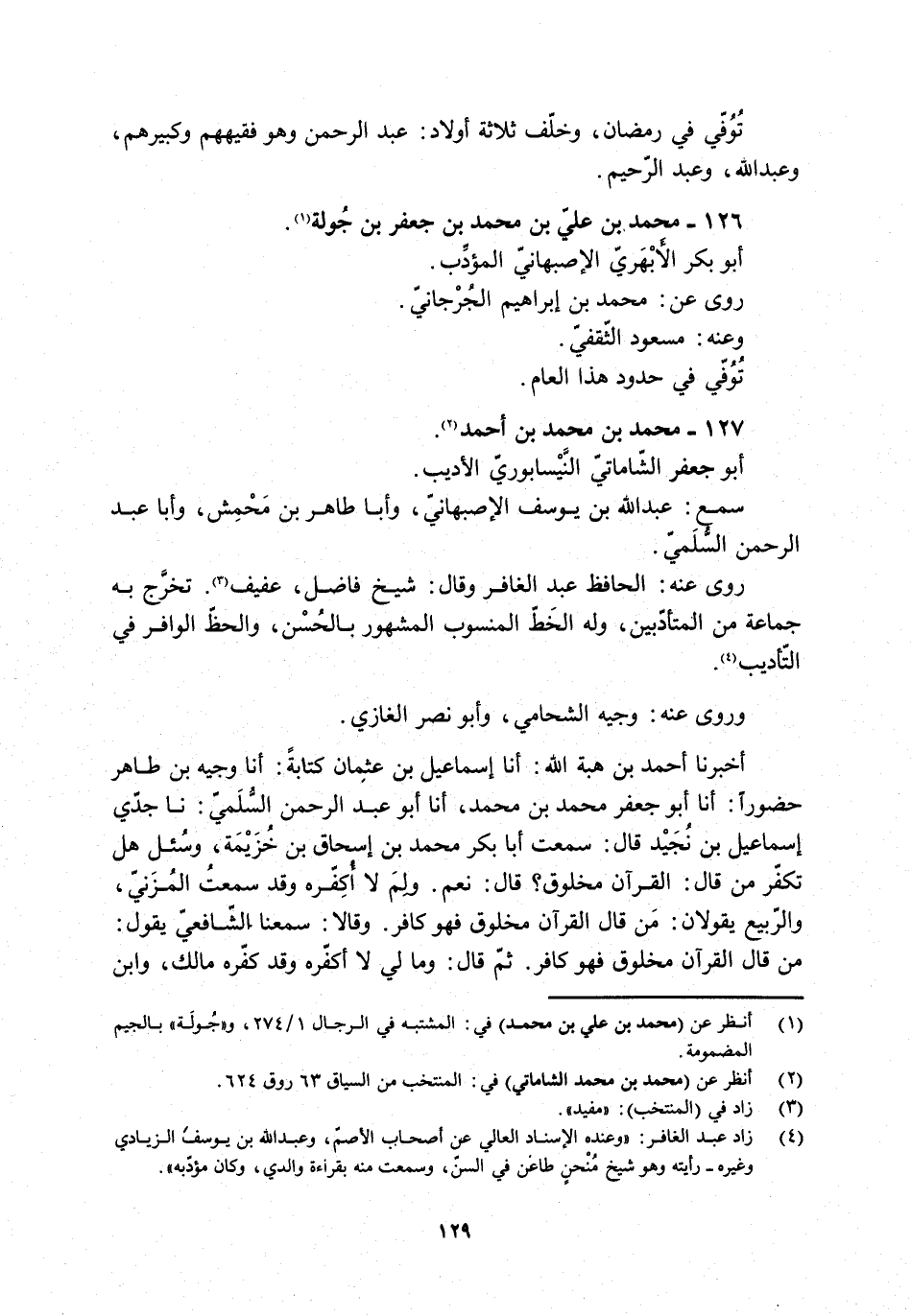 [4] زاد عبد الغافر: «وعنده الإسناد العالي عن أصحاب الأصمّ، وعبد الله بن يوسف الزيادي وغيره- رأيته وهو شيخ منحن طاعن في السن، وسمعت منه بقراءة والدي، وكان مؤدّبه» .