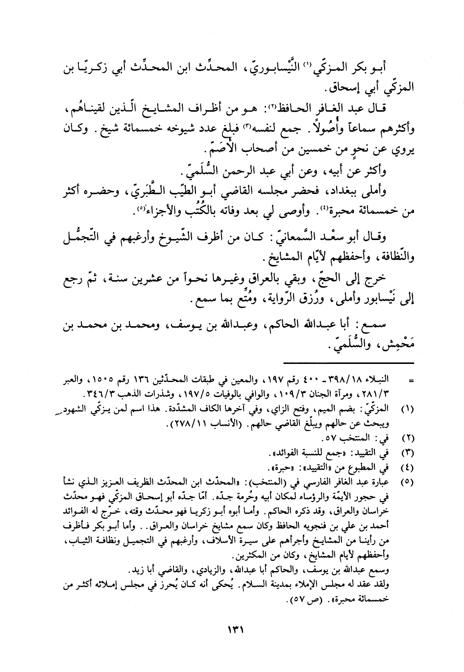 [5] عبارة عبد الغافر الفارسيّ في (المنتخب) : «المحدّث ابن المحدّث الظريف العزيز الّذي نشأ في حجور الأئمة والرؤساء لمكان أبيه وحرمة جدّه. أما جدّه أبو إسحاق المزكي فهو محدّث خراسان والعراق، وقد ذكره الحاكم، وأما أبوه أبو زكريا فهو محدّث وقته، خرج له الفوائد أحمد بن علي بن فنجويه الحافظ وكان سمع مشايخ خراسان والعراق ... وأما أبو بكر فأظرف من رأينا من المشايخ وأجرأهم على سيرة الأسلاف، وأرغبهم في التجميل ونظافة الثياب، وأحفظهم لأيام المشايخ، وكان من المكثرين.