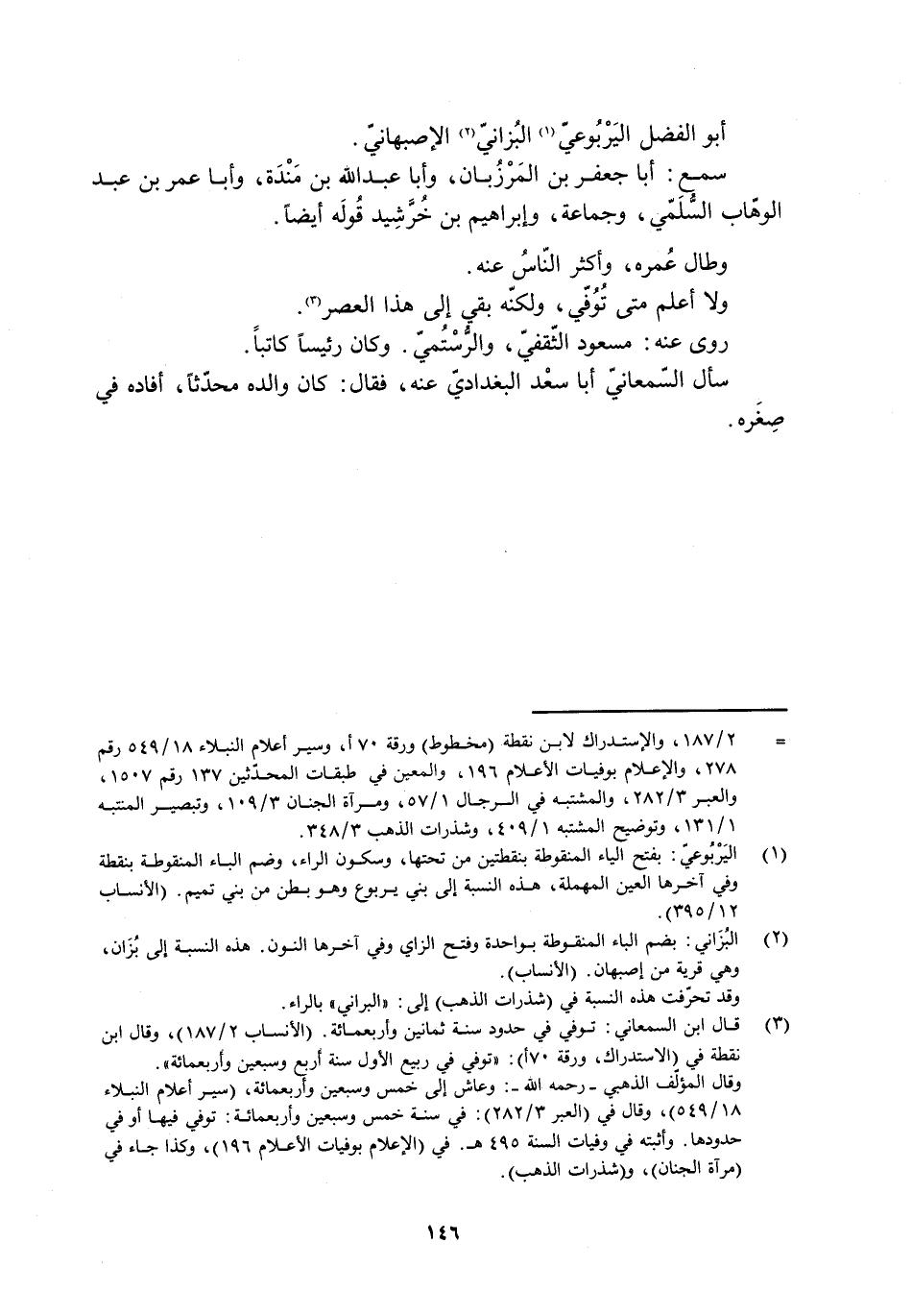 [2] البزاني: بضم الباء المنقوطة بواحدة وفتح الزاي وفي آخرها النون. هذه النسبة إلى بزان، وهي قرية من أصبهان. (الأنساب) .