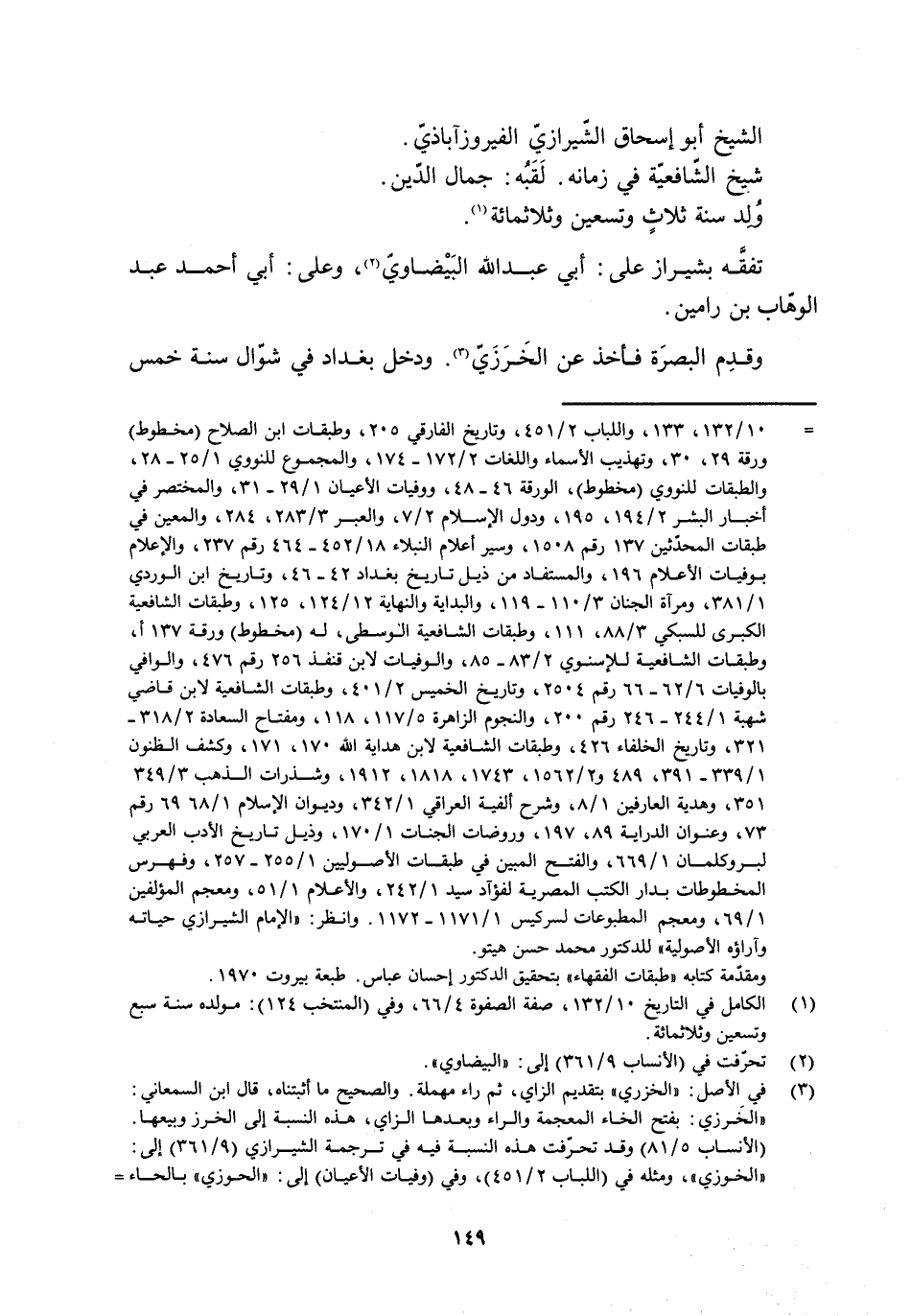 [10] / 132، 133، واللباب 2/ 451، وتاريخ الفارقيّ 205، وطبقات ابن الصلاح (مخطوط) ورقة 29، 30، وتهذيب الأسماء واللغات 2/ 172- 174، والمجموع للنووي 1/ 25- 28، والطبقات للنووي (مخطوط) ، الورقة 46- 48، ووفيات الأعيان 1/ 29- 31، والمختصر في أخبار البشر 2/ 194، 195، ودول الإسلام 2/ 7، والعبر 3/ 283، 284، والمعين في طبقات المحدّثين 137 رقم 1508، وسير أعلام النبلاء 18/ 452- 464 رقم 237، والإعلام بوفيات الأعلام 196، والمستفاد من ذيل تاريخ بغداد 42- 46، وتاريخ ابن الوردي 1/ 381، ومرآة الجنان 3/ 110- 119، والبداية والنهاية 12/ 124، 125، وطبقات الشافعية الكبرى للسبكي 3/ 88، 111، وطبقات الشافعية الوسطى، له (مخطوط) ورقة 137 أ، وطبقات الشافعية للإسنويّ 2/ 83- 85، والوفيات لابن قنفذ 256 رقم 476، والوافي بالوفيات 6/ 62- 66 رقم 2504، وتاريخ الخميس 2/ 401، وطبقات الشافعية لابن قاضي شهبة 1/ 244- 246 رقم 200، والنجوم الزاهرة 5/ 117، 118، ومفتاح السعادة 2/ 318- 321، وتاريخ الخلفاء 426، وطبقات الشافعية لابن هداية الله 170، 171، وكشف الظنون 1/ 339- 391، 489 و 2/ 1562، 1743، 1818، 1912، وشذرات الذهب 3/ 349 351، وهدية العارفين 1/ 8، وشرح الفية العراقي 1/ 342، وديوان الإسلام 1/ 68 69 رقم 73، وعنوان الدراية 89، 197، وروضات الجنات 1/ 170، وذيل تاريخ الأدب العربيّ لبروكلمان 1/ 669، والفتح المبين في طبقات الأصوليين 1/ 255- 257، وفهرست المخطوطات بدار الكتب المصرية لفؤاد سيد 1/ 242، والأعلام 1/ 51، ومعجم المؤلفين 1/ 69، ومعجم المطبوعات لسركيس 1/ 1171- 1172. وانظر: «الإمام الشيرازي حياته وآراؤه الأصولية» للدكتور محمد حسن هيتو.