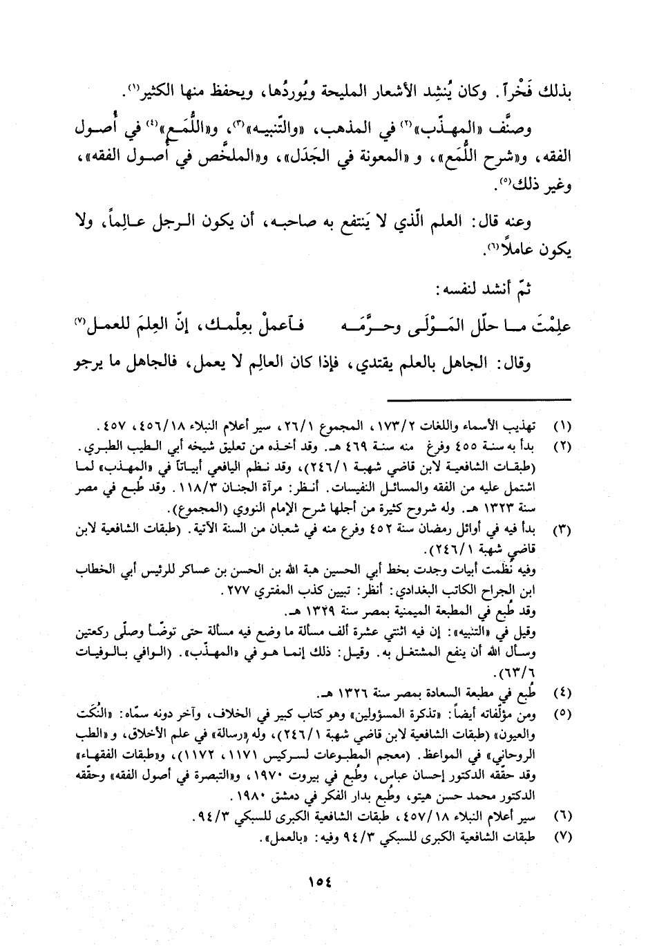 (طبقات الشافعية لابن قاضي شهبة 1/ 246) ، وقد نظم اليافعي أبياتا في «المهذب» لما اشتمل عليه من الفقه والمسائل النفيسات. انظر: مرآة الجنان 3/ 118. وقد طبع في مصر سنة 1323 هـ. وله شروح كثيرة من أجلها شرح الإمام النووي (المجموع) .