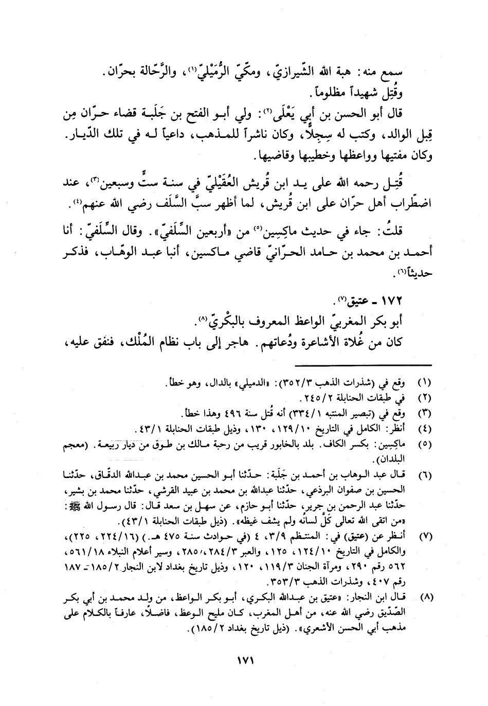 [7] انظر عن (عتيق) في: المنتظم 9/ 3، 4 (في حوادث سنة 475 هـ.) (16/ 224، 225) ، والكامل في التاريخ 10/ 124، 125، والعبر 3/ 284، 285، وسير أعلام النبلاء 18/ 561، 562 رقم 290، ومرآة الجنان 3/ 119، 120، وذيل تاريخ بغداد لابن النجار 2/ 185- 187 رقم 407، وشذرات الذهب 3/ 353.