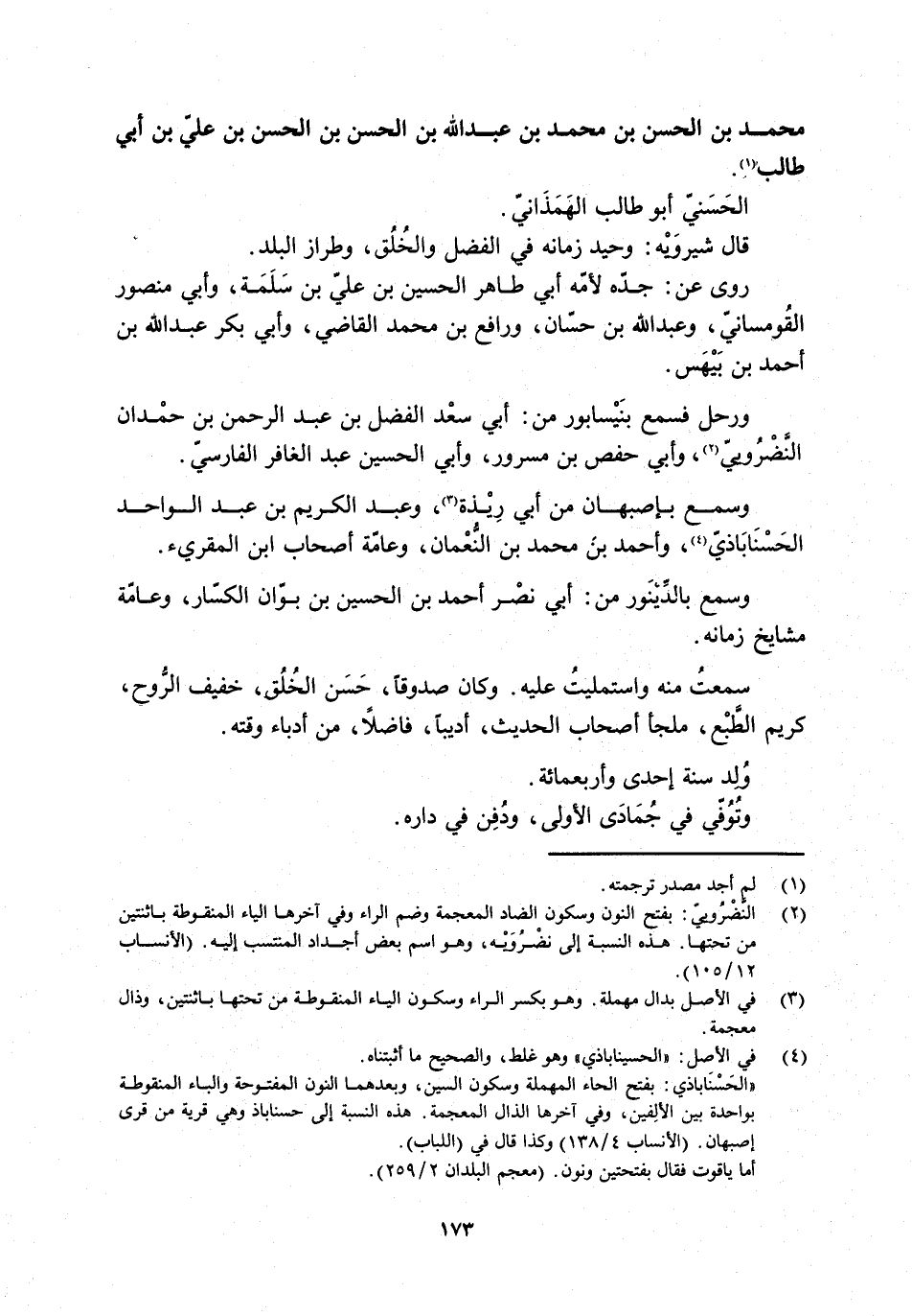 [2] النّضروبي: بفتح النون وسكون الضاد المعجمة وضم الراء وفي آخرها الياء المنقوطة باثنتين من تحتها. هذه النسبة إلى نضرويه، وهو اسم بعض أجداد المنتسب إليه، (الأنساب 12/ 105) .