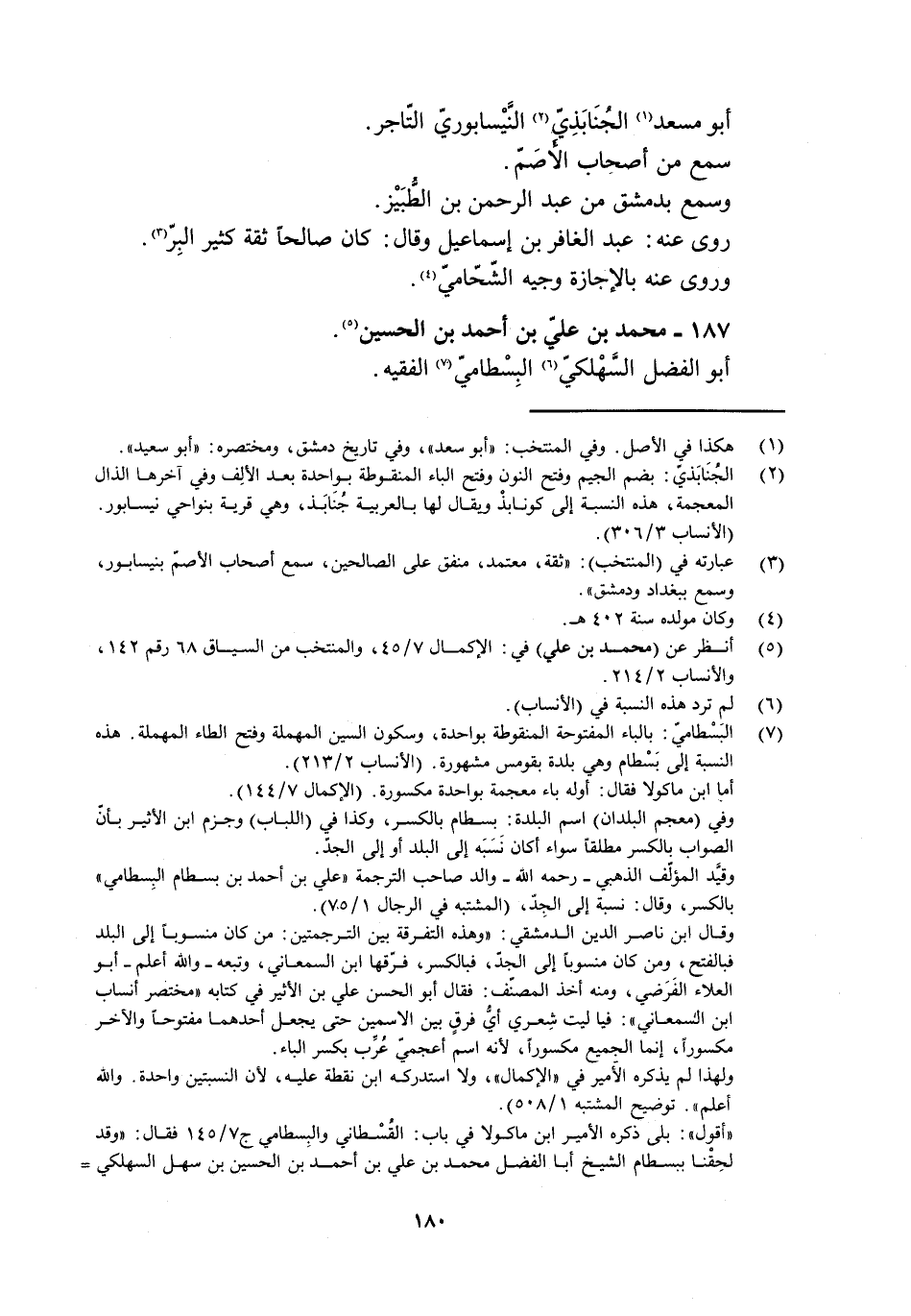 «أقول» : بلى ذكره الأمير ابن ماكولا في باب: القسطاني والبسطامي ج 7/ 145 فقال: «وقد لحقنا ببسطام الشيخ أبا الفضل محمد بن علي بن أحمد بن الحسين بن سهل السهلكي