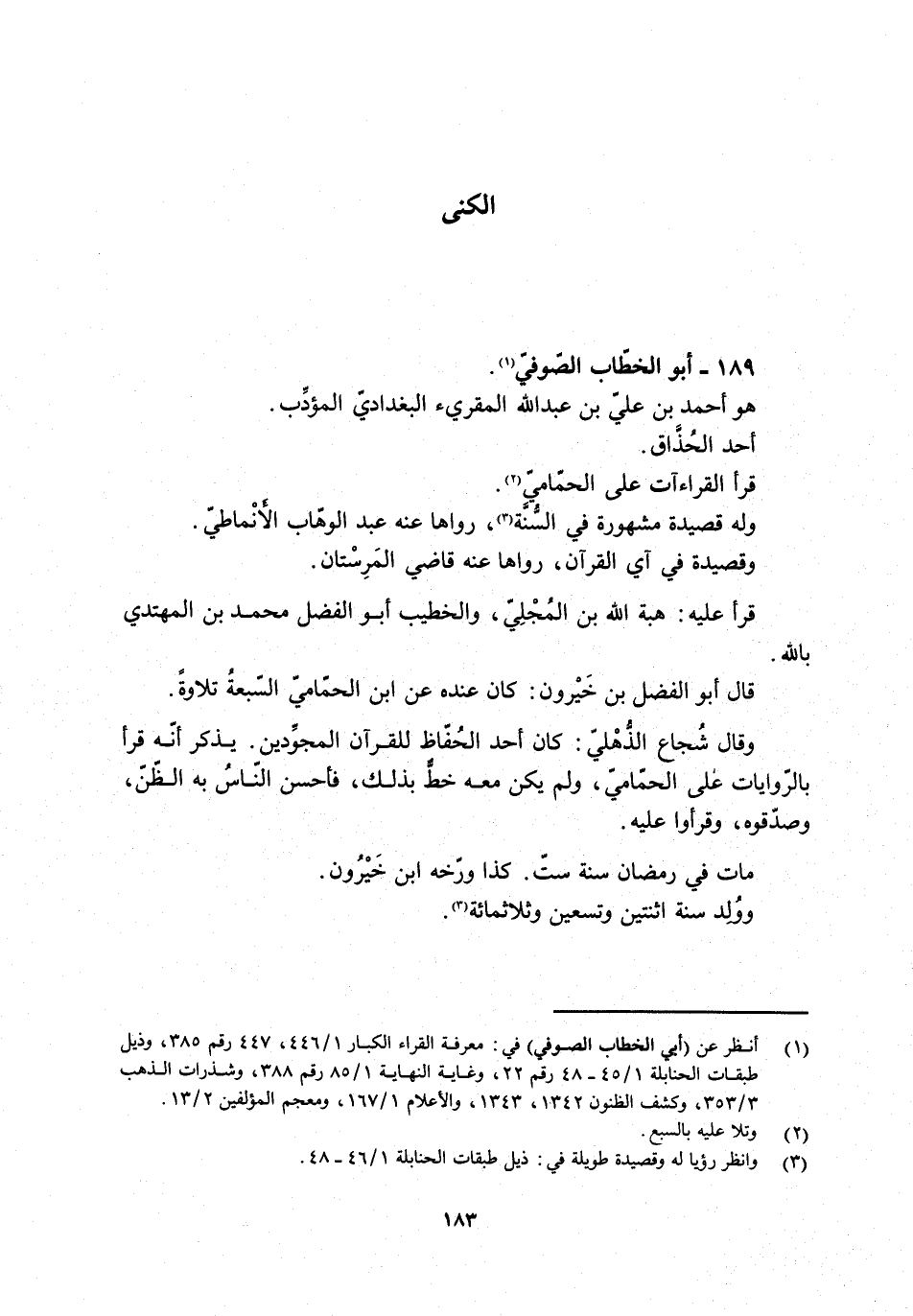 [1] انظر عن (أبي الخطاب الصوفي) في: معرفة القراء الكبار 1/ 446، 447 رقم 385، وذيل طبقات الحنابلة 1/ 45- 48 رقم 22، وغاية النهاية 1/ 85 رقم 388، وشذرات الذهب 3/ 353، وكشف الظنون 1342، 1343، والأعلام 1/ 167، ومعجم المؤلفين 2/ 13.