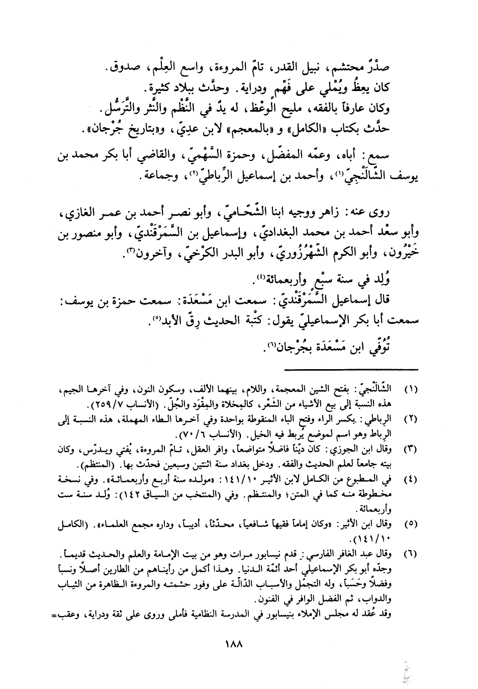 وجدّه أبو بكر الإسماعيلي أحد أئمة الدنيا. وهذا أكمل من رأيناهم من الطارين أصلا ونسبا وفضلا وحسبا، وله التجمل والأسباب الدالّة على وفور حشمته والمروءة الظاهرة من الثياب والدواب، ثم الفضل الوافر في الفنون.
