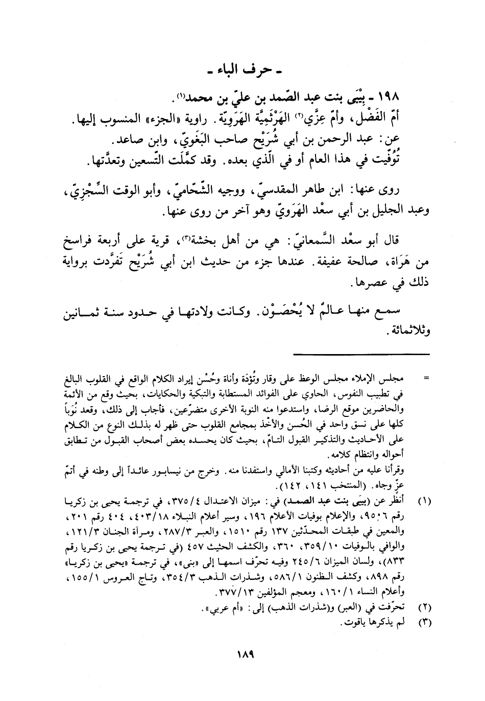 [1] انظر عن (بيبى بنت عبد الصمد) في: ميزان الاعتدال 4/ 375، في ترجمة يحيى بن زكريا رقم 9506، والإعلام بوفيات الأعلام 196، وسير أعلام النبلاء 18/ 403، 404 رقم 201، والمعين في طبقات المحدّثين 137 رقم 1510، والعبر 3/ 287، ومرآة الجنان 3/ 121، والوافي بالوفيات 10/ 359، 360، والكشف الحثيث 457 (في ترجمة يحيى بن زكريا رقم 833) ، ولسان الميزان 6/ 245 وفيه تحريف اسمها إلى «بنى» ، في ترجمة «يحيى بن زكريا» رقم 898، وكشف الظنون 1/ 586، وشذرات الذهب 3/ 354، وتاج العروس 1/ 155، وأعلام النساء 1/ 160، ومعجم المؤلفين 13/ 377.