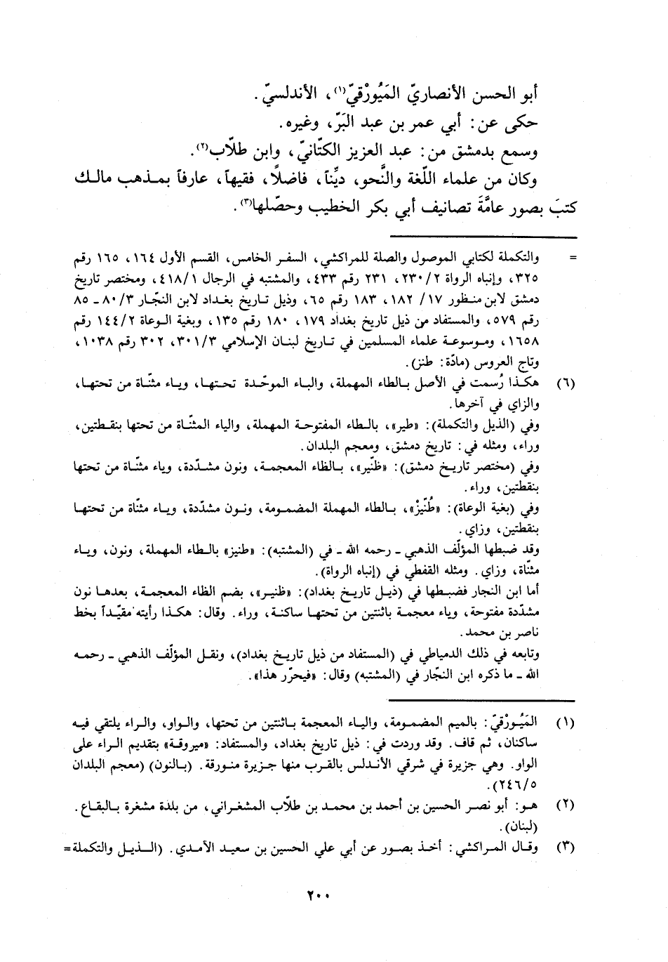 [2] الميورقيّ: بالميم المضمومة، والياء المعجمة باثنتين من تحتها، والواو، والراء يلتقي فيه ساكنان، ثم قاف. وقد وردت في: ذيل تاريخ بغداد، والمستفاد: «ميروقة» بتقديم الراء على الواو. وهي جزيرة في شرقي الأندلس بالقرب منها جزيرة منورقة. (بالنون) (معجم البلدان 5/ 246) .