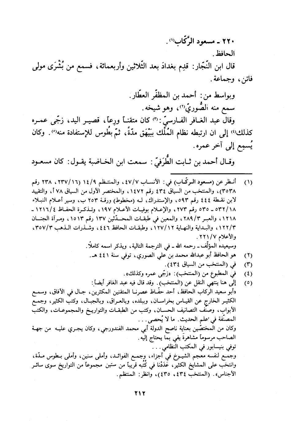 [1] انظر عن (مسعود الركاب) في: الأنساب 7/ 47، والمنتظم 9/ 14 (16/ 237، 238 رقم 3538) ، والمنتخب من السياق 434 رقم 1472، والمختصر الأول من السياق 78 أ، والتقييد لابن نقطة 444 رقم 593، والإستدراك، له (مخطوط) ورقة 253 ب، وسير أعلام النبلاء 18/ 532- 535 رقم 273، والإعلام بوفيات الأعلام 197، وتذكرة الحفاظ 4/ 1216- 1218، والعبر 3/ 289، والمعين في طبقات المحدثين 137 رقم 1513، ومرآة الجنان 3/ 122، والبداية والنهاية 12/ 127، وطبقات الحافظ 446، وشذرات الذهب 3/ 357، والأعلام 7/ 221.