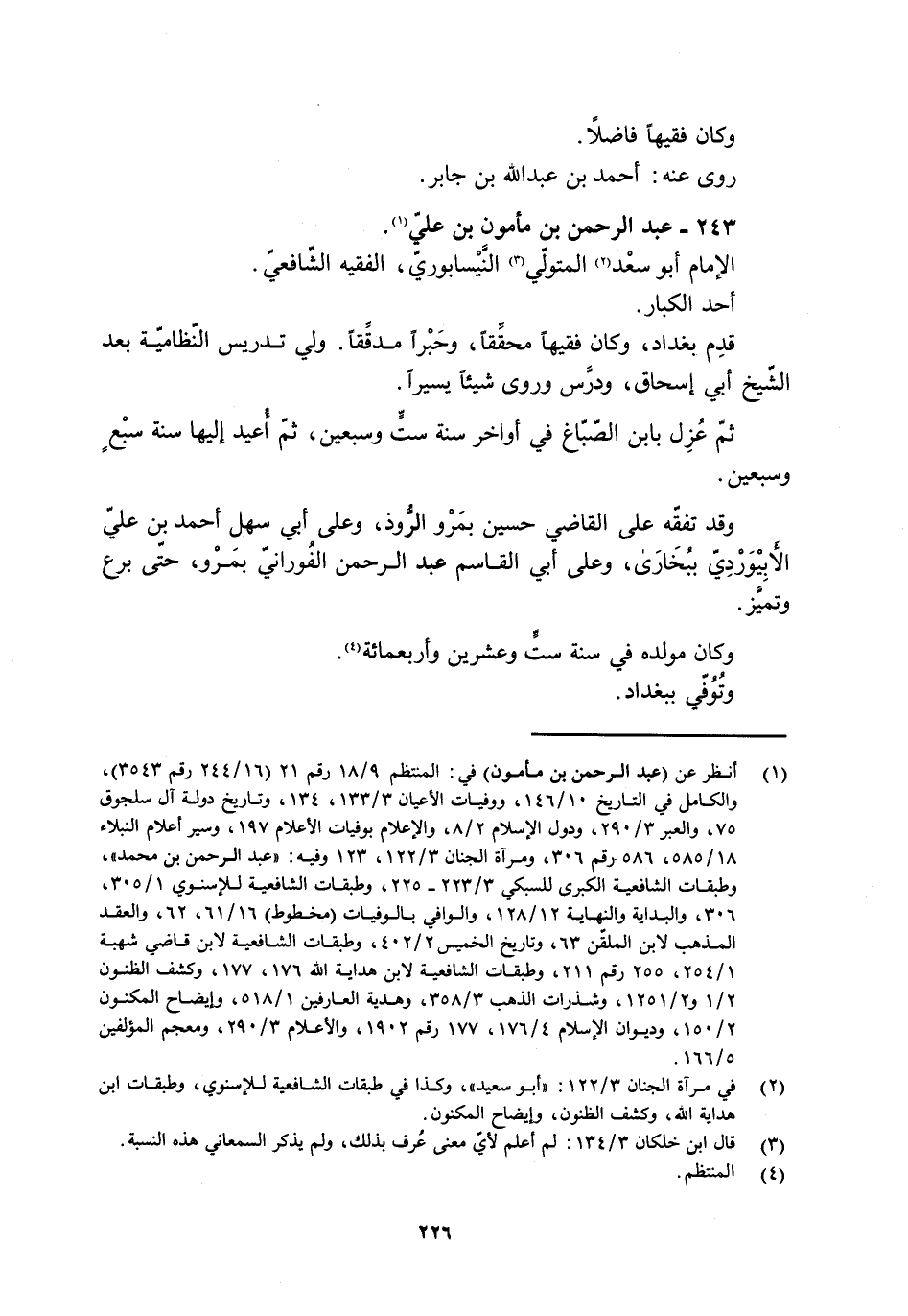 [1] انظر عن (عبد الرحمن بن مأمون) في: المنتظم 9/ 18 رقم 21 (16/ 244 رقم 3543) ، والكامل في التاريخ 10/ 146، ووفيات الأعيان 3/ 133، 134، وتاريخ دولة آل سلجوق 75، والعبر 3/ 290، ودول الإسلام 2/ 8، والإعلام بوفيات الأعلام 197، وسير أعلام النبلاء 18/ 585، 586 رقم 306، ومرآة الجنان 3/ 122، 123 وفيه: «عبد الرحمن بن محمد» ، وطبقات الشافعية الكبرى للسبكي 3/ 223- 225، وطبقات الشافعية للإسنويّ 1/ 305، 306، والبداية والنهاية 12/ 128، والوافي بالوفيات (مخطوط) 16/ 61، 62، والعقد المذهب لابن الملقّن 63، وتاريخ الخميس 2/ 402، وطبقات الشافعية لابن قاضي شهبة 1/ 254، 255 رقم 211، وطبقات الشافعية لابن هداية الله 176، 177، وكشف الظنون 2/ 1 و 2/ 1251، وشذرات الذهب 3/ 358، وهدية العارفين 1/ 518، وإيضاح المكنون 2/ 150، وديوان الإسلام 4/ 176، 177 رقم 1902، والأعلام 3/ 290، ومعجم المؤلفين 5/ 166.