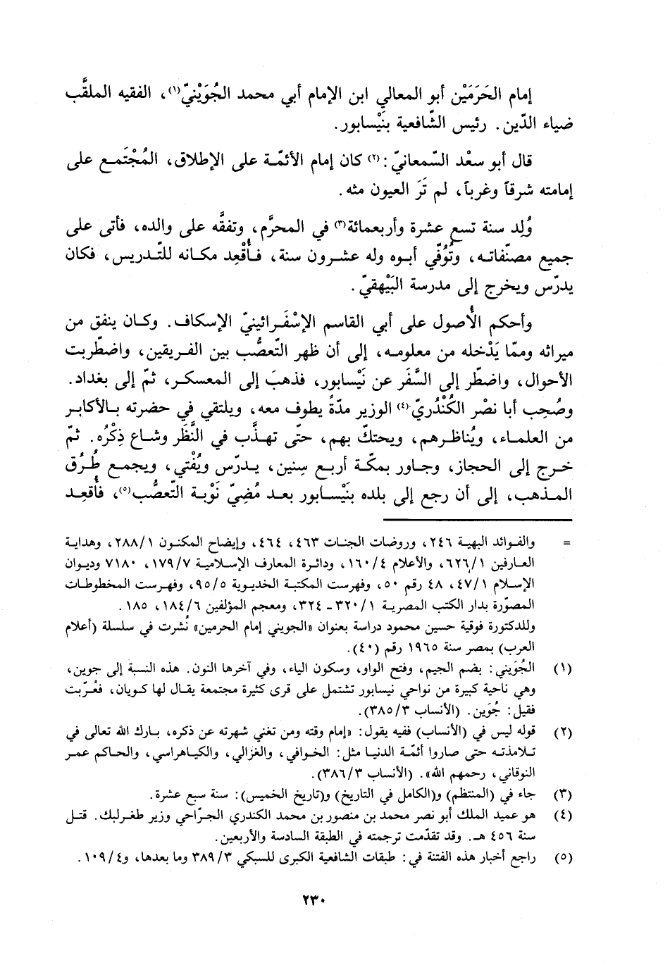[1] الجويني: بضم الجيم، وفتح الواو، وسكون الياء، وفي آخرها النون. هذه النسبة إلى جوين، وهي ناحية كبيرة من نواحي نيسابور تشتمل على قرى كثيرة مجتمعة يقال لها كويان، فعربت فقيل: جوين. (الأنساب 3/ 385) .