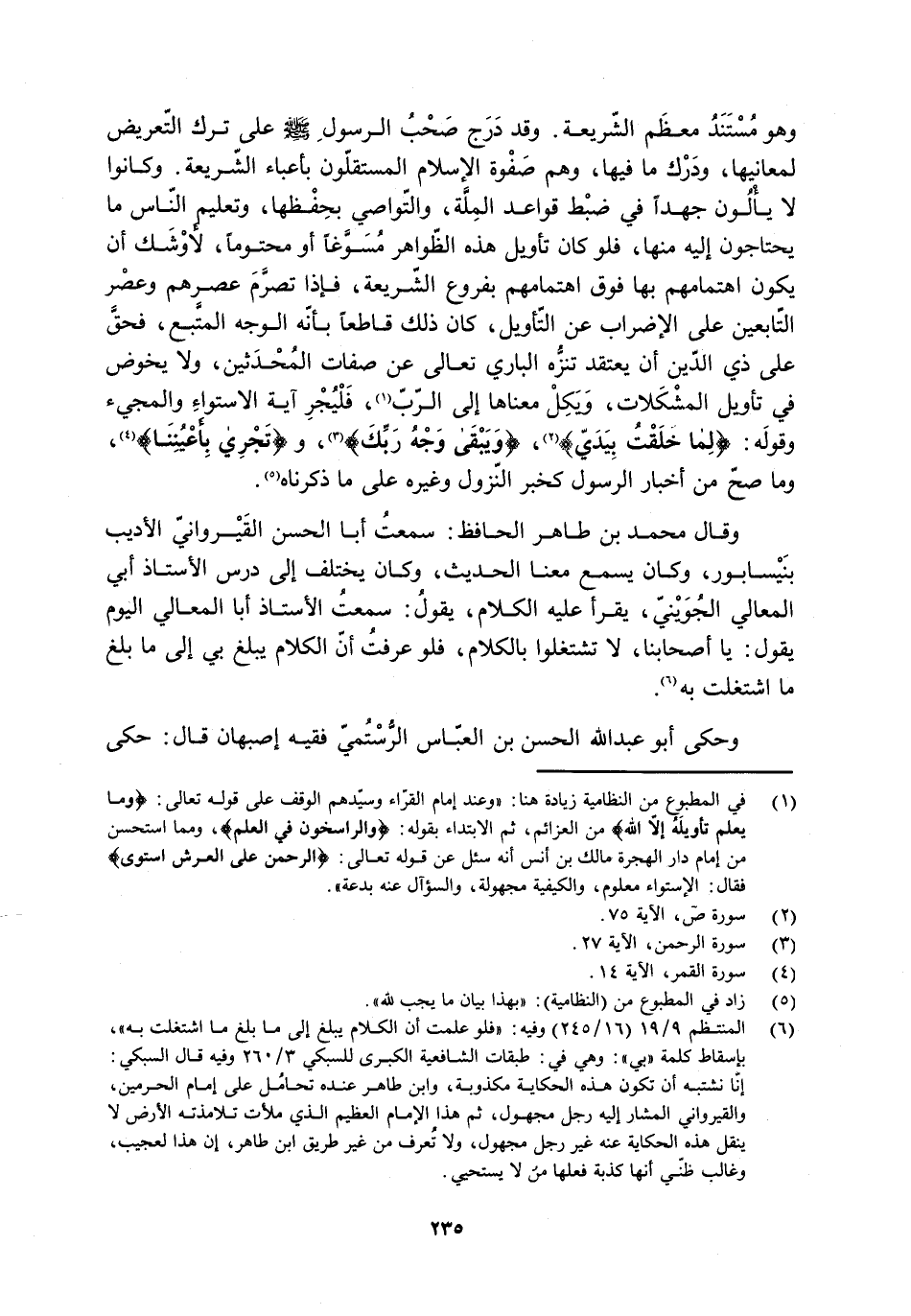 وهو مُسْتَنَدُ معظَم الشريعة. وقد دَرَج صَحْبُ الرسول صلى الله عليه وآله وسلم على ترك التّعريض لمعانيها، ودَرْك ما فيها، وهم صفوة الإسلام المستقلون بأعباء الشريعة. وكانوا لا يأْلُون جهدًا في ضبط قواعد المِلَّة، والتّواصي بحِفْظها، وتعليم النّاس ما يحتاجون إليه منها، فلو كان تأويل هذه الظواهر مسوغًا أو محتومًا، لأوْشَك أن يكون اهتمامهم بها فوق اهتمامهم بفروع الشريعة، فإذا تصرَّمَ عصرهم وعصْر التابعين على الإضراب عن التأويل، كان ذلك قاطعّا بأنّه الوجه المتبع، فحقَّ على ذي الدّين أن يعتقد تنزه الباري تعالى عن صفات المُحْدَثين، ولا يخوض في تأويل المشْكَلات، وَيَكل معناها إلى الرّبّ [1] ، فَلْيُجْر آية الاستواء والمجيء وقوله: لِما خَلَقْتُ بِيَدَيَّ 38: 75 [2] ، وَيَبْقى وَجْهُ رَبِّكَ 55: 27 [3] ، وتَجْرِي بِأَعْيُنِنا 54: 14 [4] ، وما صح من أخبار الرسول كخبر النّزول وغيره على ما ذكرناه [5] .