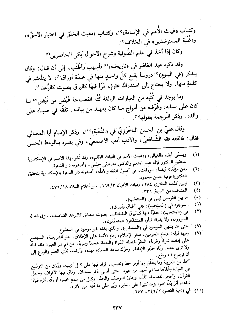 [9] وفيها قوله: «إمام الحرمين، فخر الإسلام، إمام الأئمة على الإطلاق. حبر الشريعة، المجتمع على إمامته شرقا وغربا. والمقرّ بفضله السراة والحداة عجما وعربا، من لم تر العيون مثله قبله ولا ترى بعده. ورباه حجر الإمامة، وحرّك ساعد السعادة مهده، وأرضعه ثدي العلم والورع إلى أن ترعرع فيه ويفع.