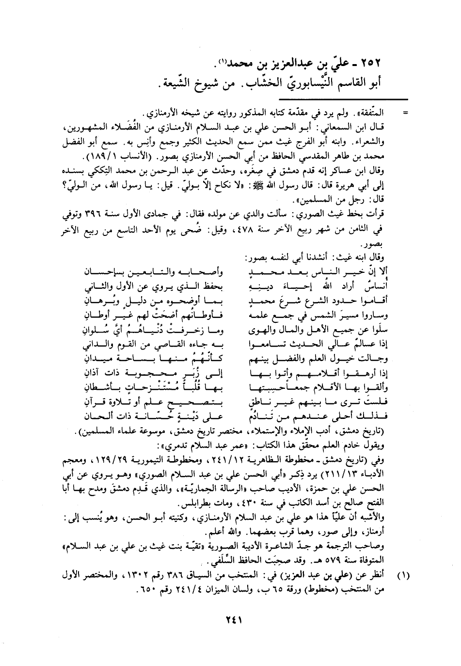 وفي (تاريخ دمشق- مخطوطة الظاهرية 12/ 241، ومخطوطة التيمورية 29/ 129، ومعجم الأدباء 13/ 211) يرد ذكر «أبي الحسن علي بن عبد السلام الصوري» وهو يروي عن أبي الحسن علي بن حمزة، الأديب صاحب «الرسالة الحماريّة» ، والّذي قدم دمشق ومدح بها أبا الفتح صالح بن أسد الكاتب في سنة 430، ومات بطرابلس.