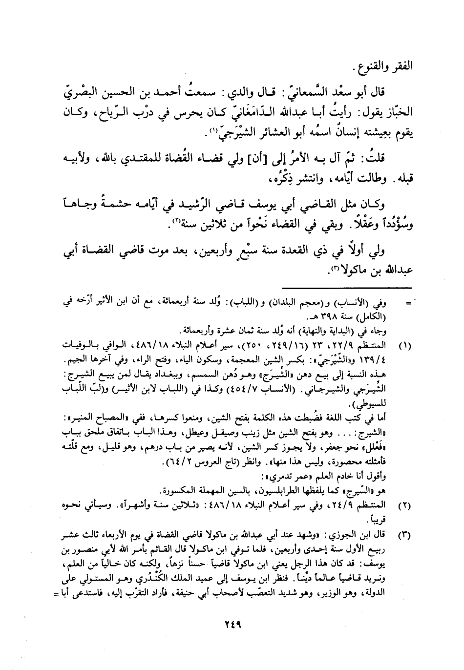[1] المنتظم 9/ 22، 23 (16/ 249، 250) ، سير أعلام النبلاء 18/ 486، الوافي بالوفيات 4/ 139 و «الشّيرجيّ» : بكسر الشين المعجمة، وسكون الياء، وفتح الراء، وفي آخرها الجيم.