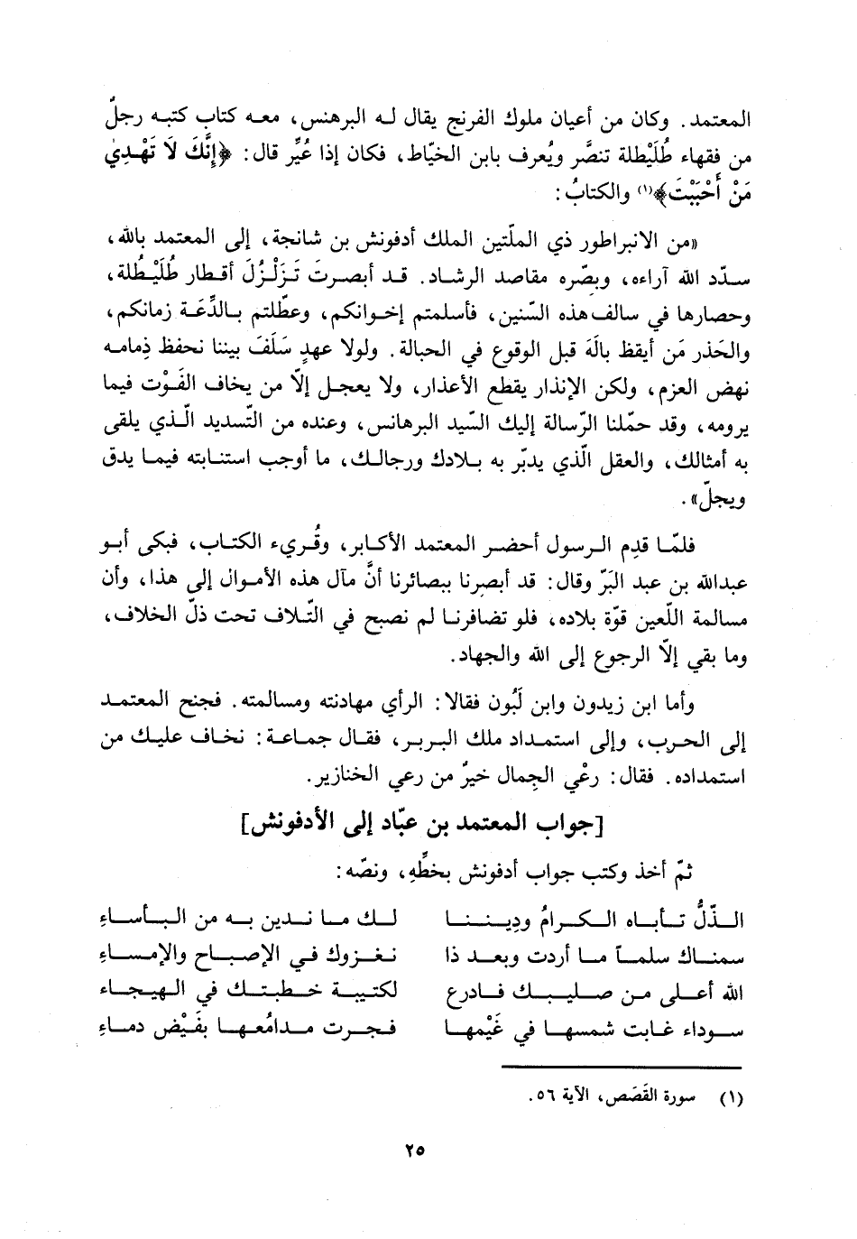 المعتمد. وكان من أعيان ملوك الفرنج يقال له البرهنس، معه كتاب كتبه رجلُ من فقهاء طُلَيْطلة تنصَّر ويُعرف بابن الخيّاط، فكان إذا عُيِّر قال: إِنَّكَ لا تَهْدِي مَنْ أَحْبَبْتَ 28: 56 [1] والكتاب: