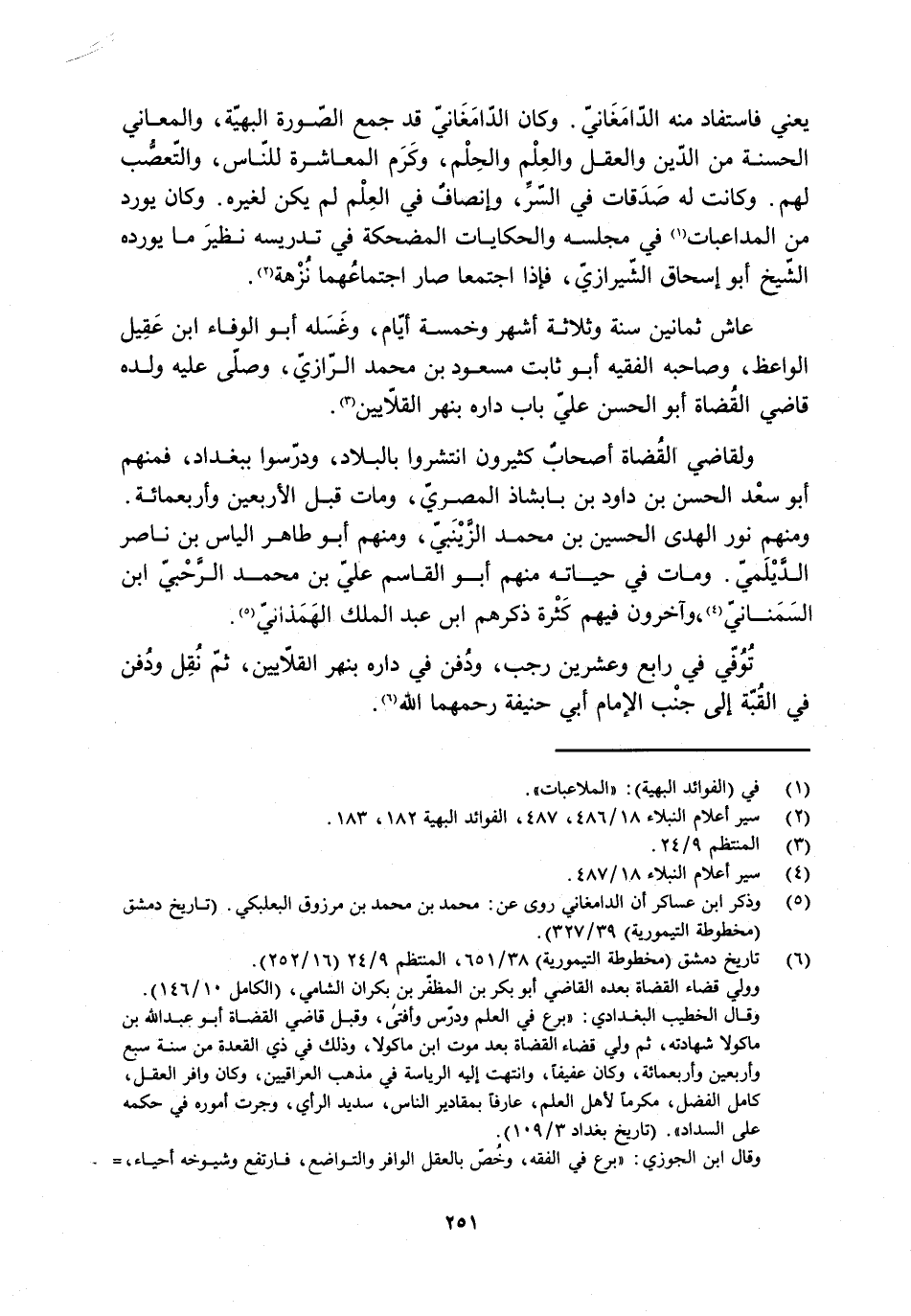 يعني فاستفاد منه الدّامَغَانيّ. وكان الدّامَغَانيّ قد جمع الصّورة البهيّة، والمعاني الحسنة من الدّين والعقل والعِلْم والحِلْم، وكَرَم المعاشرة للنّاس، والتّعصُّب لهم. وكانت له صَدَقات في السّرّ، وإنصافٌ في العِلْم لم يكن لغيره. وكان يورد من المداعبات [1] في مجلسه والحكايات المضحكة في تدريسه نظيرَ ما يورده الشّيخ أبو إسحاق الشّيرازيّ، فإذا اجتمعا صار اجتماعهما نُزْهة [2] .