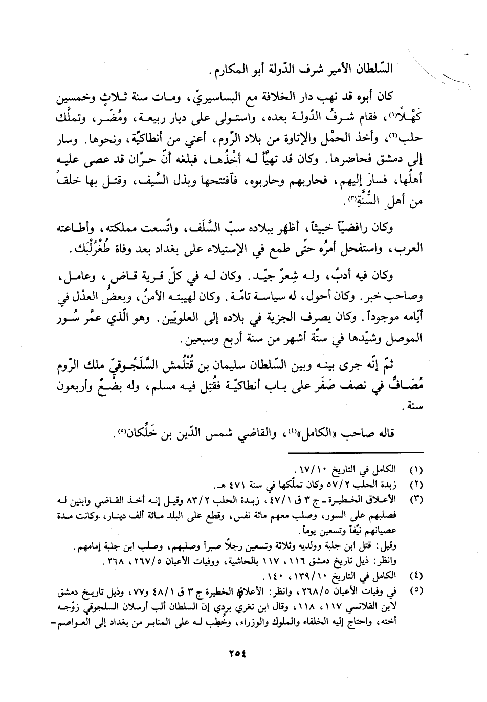 [5] في وفيات الأعيان 5/ 268، وانظر: الأعلاق الخطيرة ج 3 ق 1/ 48 و 77، وذيل تاريخ دمشق لابن القلانسي 117، 118، وقال ابن تغري بردي إن السلطان ألب أرسلان السلجوقي زوّجه أخته، واحتاج إليه الخلفاء والملوك والوزراء، وخطب له على المنابر من بغداد إلى العواصم-