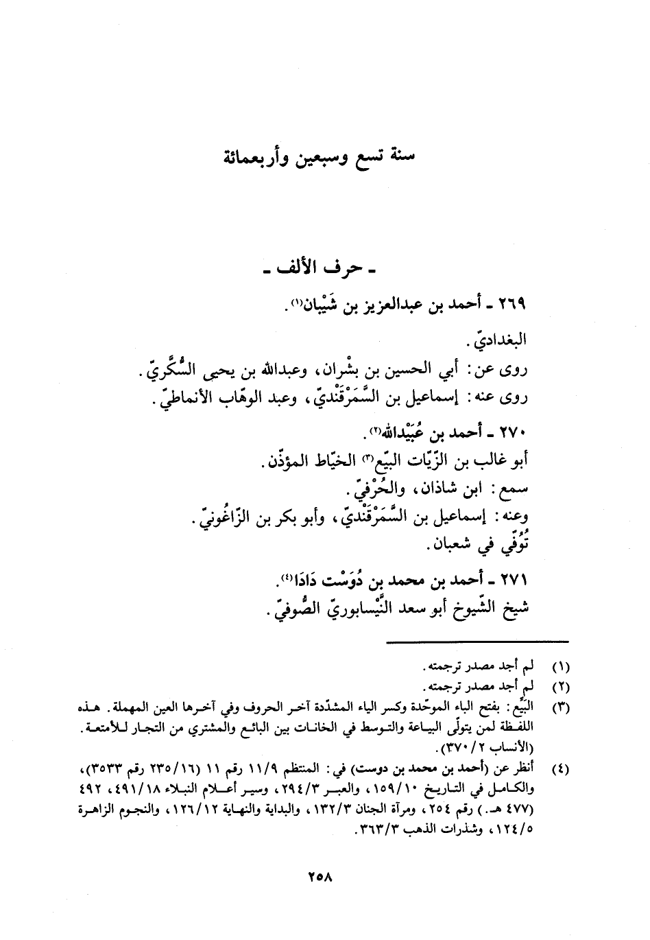 [4] انظر عن (أحمد بن محمد بن دوست) في: المنتظم 9/ 11 رقم 11 (16/ 235 رقم 3533) ، والكامل في التاريخ 10/ 159، والعبر 3/ 294، وسير أعلام النبلاء 18/ 491، 492 (477 هـ.) رقم 254، ومرآة الجنان 3/ 132، والبداية والنهاية 12/ 126، والنجوم الزاهرة 5/ 124، وشذرات الذهب 3/ 363.
