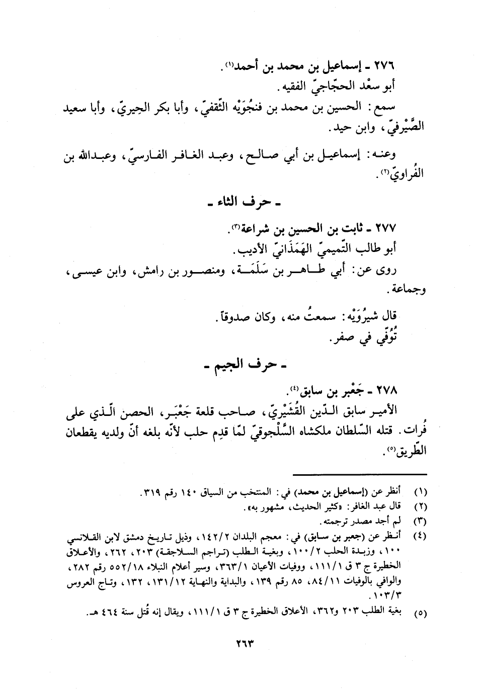 [4] انظر عن (جعبر بن سابق) في: معجم البلدان 2/ 142، وذيل تاريخ دمشق لابن القلانسي 100، وزبدة الحلب 2/ 100، وبغية الطلب (تراجم السلاجقة) 203، 262، والأعلاق الخطيرة ج 3 ق 1/ 111، ووفيات الأعيان 1/ 363، وسير أعلام النبلاء 18/ 552 رقم 282، والوافي بالوفيات 11/ 84، 85 رقم 139، والبداية والنهاية 12/ 131، 132، وتاج العروس 3/ 103.