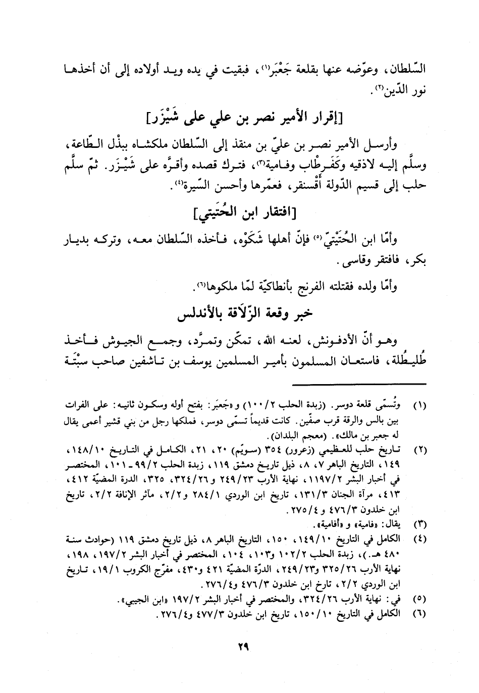 [2] تاريخ حلب للعظيميّ (زعرور) 354 (سويّم) 20، 21، الكامل في التاريخ 10/ 148، 149، التاريخ الباهر 7، 8، ذيل تاريخ دمشق 119، زبدة الحلب 2/ 99- 101، المختصر في أخبار البشر 2/ 1197، نهاية الأرب 23/ 249 و 26/ 324، 325، الدرة المضيّة 412، 413، مرآة الجنان 3/ 131، تاريخ ابن الوردي 1/ 284 و 2/ 2، مآثر الإنافة 2/ 2، تاريخ ابن خلدون 3/ 476 و 4/ 275.