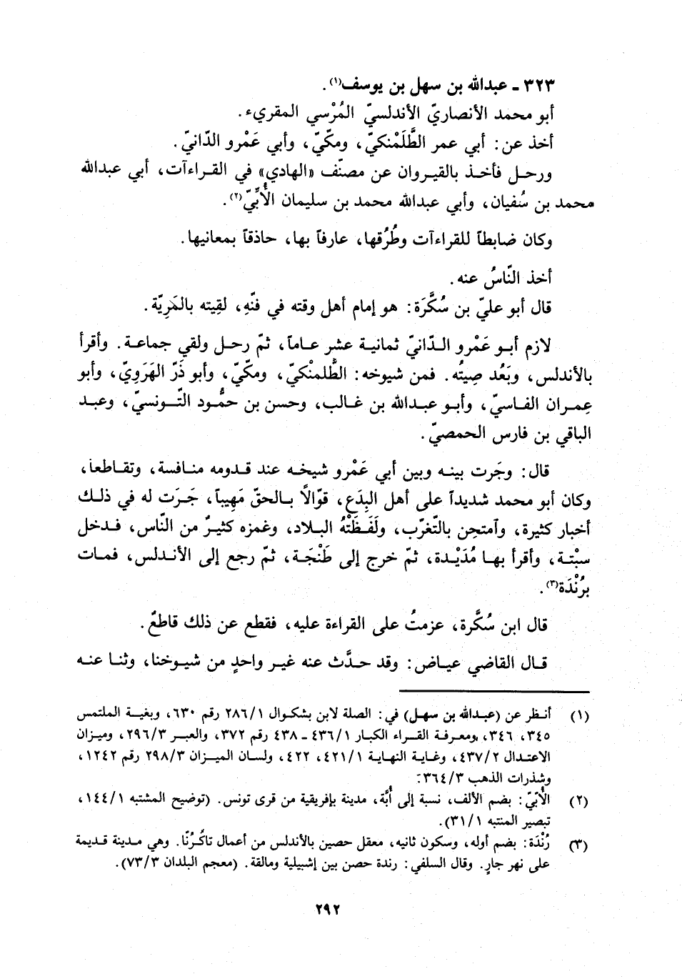 [1] انظر عن (عبد الله بن سهل) في: الصلة لابن بشكوال 1/ 286 رقم 630، وبغية الملتمس 345، 346، ومعرفة القراء الكبار 1/ 436- 438 رقم 372، والعبر 3/ 296، وميزان الاعتدال 2/ 437، وغاية النهاية 1/ 421، 422، ولسان الميزان 3/ 298 رقم 1242، وشذرات الذهب 3/ 364.