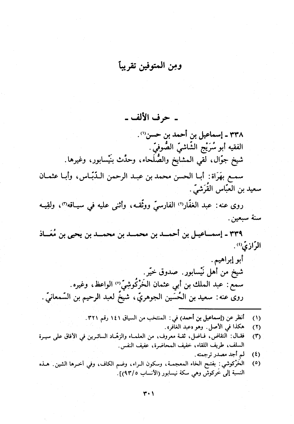 339- إسماعيل بْن أحمد بْن محمد بن محمد بْن يحيى بن مُعَاذ الرّازيّ [4] أبو إبراهيم. شيخ من أهل نَيْسابور. صدوق خيّر.
