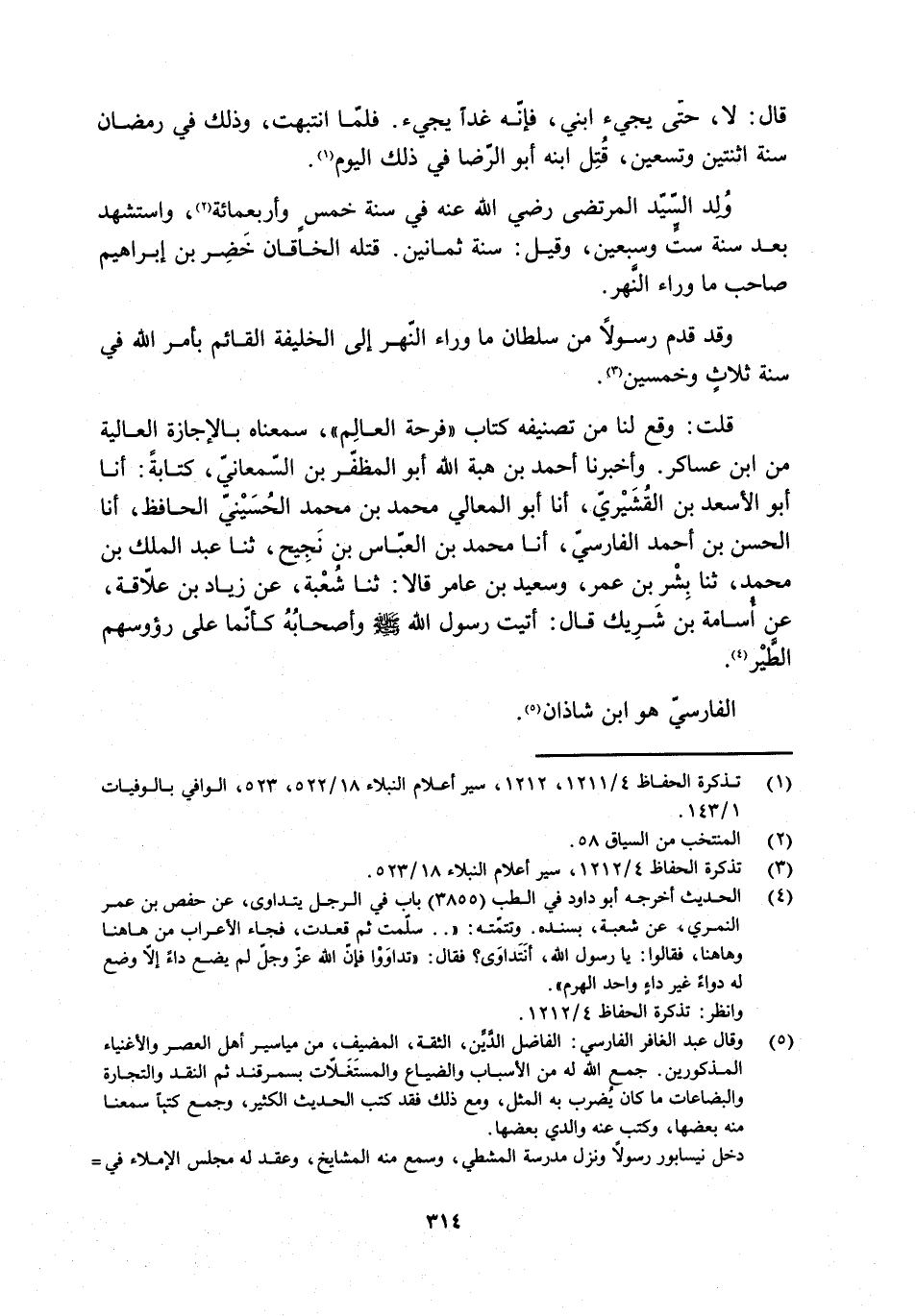 قلت: وقع لنا من تصنيفه كتاب «فرحة العالِم» ، سمعناه بالإجازة العالية من ابن عساكر. وَأَخْبَرَنَا أَحْمَدُ بْنُ هِبَةِ اللَّهِ أَبُو الْمُظَفَّرِ بْنِ السَّمْعَانِيِّ، كِتَابَةً: أنا أَبُو الأَسْعَدِ بْنُ الْقُشَيْرِيِّ، أنا أَبُو الْمَعَالِي مُحَمَّدُ بْنُ مُحَمَّدٍ الْحُسَيْنِيُّ الْحَافِظُ، أنا الْحَسَنُ بْنُ أَحْمَدَ الْفَارِسِيُّ، أنا مُحَمَّدُ بْنُ الْعَبَّاسِ بْنِ نَجِيحٍ، ثنا عَبْدُ الْمَلِكِ بْنُ مُحَمَّدٍ، ثنا بِشْرُ بْنُ عُمَرَ، وَسَعِيدُ بْنُ عَامِرٍ قَالا: ثنا شُعْبَةُ، عَنْ زِيَادِ بْنِ عِلاقَةَ، عَنْ أُسَامَةَ بْنِ شَرِيكٍ قَالَ: أَتَيْتُ رَسُولَ اللَّهِ صَلَّى اللَّهُ عَلَيْهِ وآله وَسَلَّمَ وَأَصْحَابُهُ كَأَنَّمَا عَلَى رُءُوسِهِمُ الطَّيْرُ [4] .