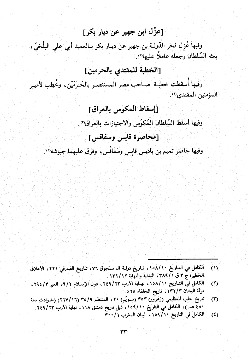 [2] الكامل في التاريخ 10/ 158، نهاية الأرب 23/ 249، دول الإسلام 2/ 9، العبر 3/ 294، مرآة الجنان 3/ 132، تاريخ الخلفاء 425.