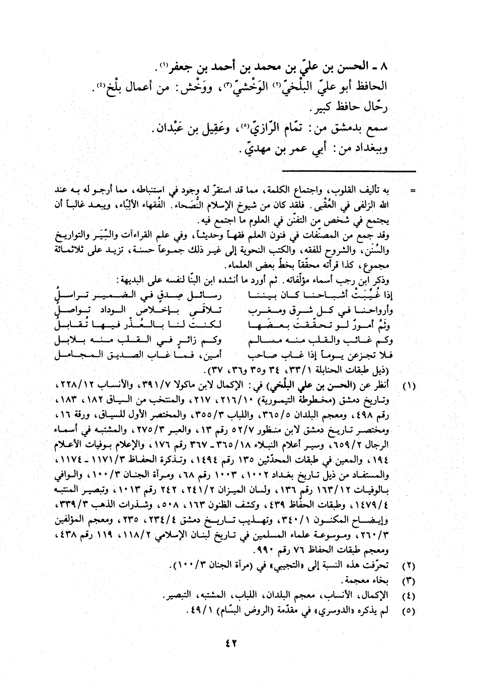 [1] انظر عن (الحسن بن علي البلخي) في: الإكمال لابن ماكولا 7/ 391، والأنساب 12/ 228، وتاريخ دمشق (مخطوطة التيمورية) 10/ 216، 217، والمنتخب من السياق 182، 183، رقم 498، ومعجم البلدان 5/ 365، واللباب 3/ 355، والمختصر الأول للسياق، ورقة 16، ومختصر تاريخ دمشق لابن منظور 7/ 52 رقم 13، والعبر 3/ 275، والمشتبه في أسماء الرجال 2/ 659، وسير أعلام النبلاء 18/ 365- 367 رقم 176، والإعلام بوفيات الأعلام 194، والمعين في طبقات المحدّثين 135 رقم 1494، وتذكرة الحفاظ 3/ 1171- 1174، والمستفاد من ذيل تاريخ بغداد 1002، 1003 رقم 68، ومرآة الجنان 3/ 100، والوافي بالوفيات 12/ 163 رقم 136، ولسان الميزان 2/ 241، 242 رقم 1013، وتبصير المنتبه 4/ 1479، وطبقات الحفاظ 439، وكشف الظنون 163، 508، وشذرات الذهب 3/ 339، وإيضاح المكنون 1/ 340، وتهذيب تاريخ دمشق 4/ 234، 235، ومعجم المؤلفين 3/ 260، وموسوعة علماء المسلمين في تاريخ لبنان الإسلامي 2/ 118، 119 رقم 438، ومعجم طبقات الحفاظ 76 رقم 990.