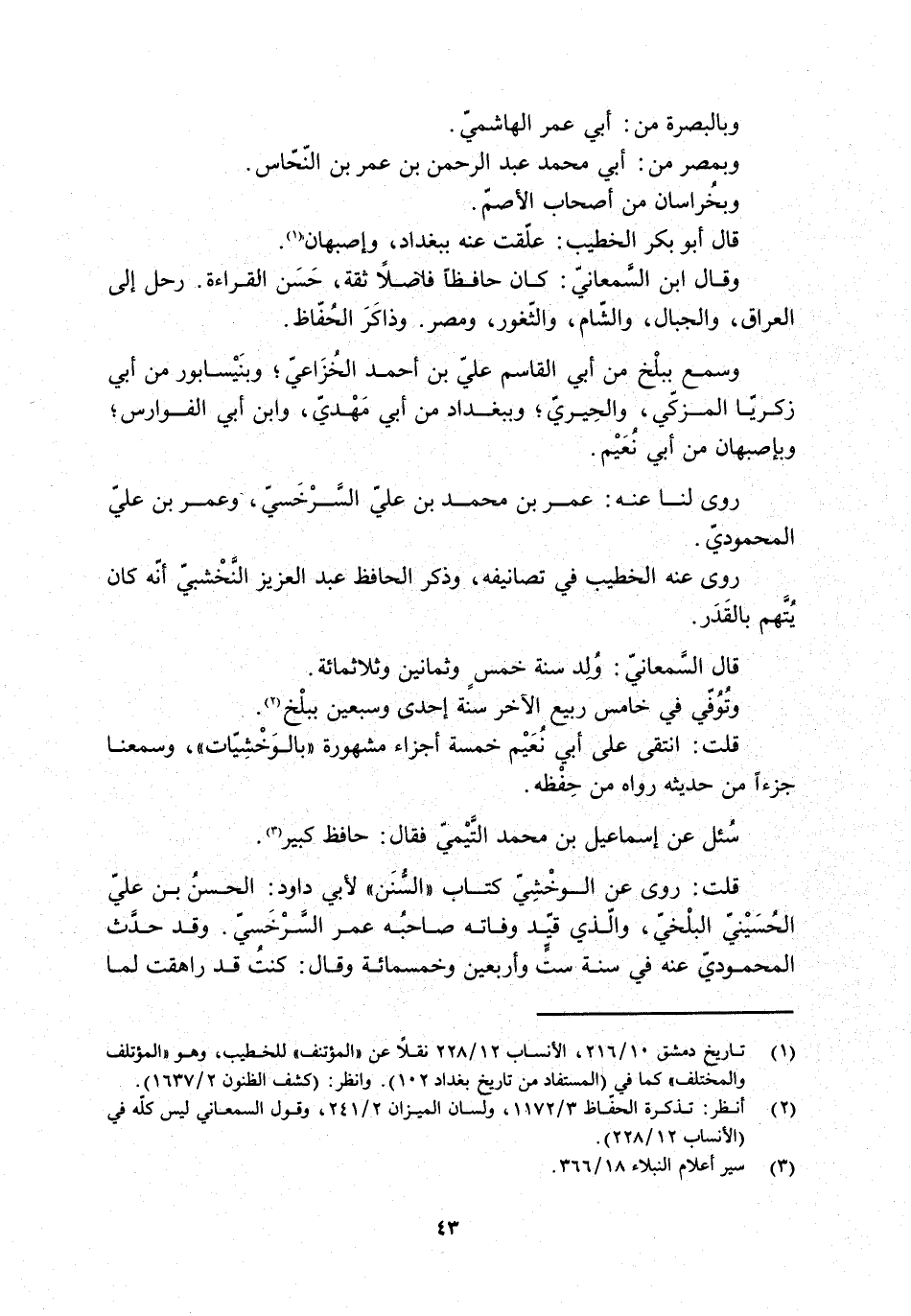 [1] تاريخ دمشق 10/ 216، الأنساب 12/ 228 نقلا عن «المؤتنف» للخطيب، وهو «المؤتلف والمختلف» كما في (المستفاد من تاريخ بغداد 102) . وانظر: (كشف الظنون 2/ 1637) .