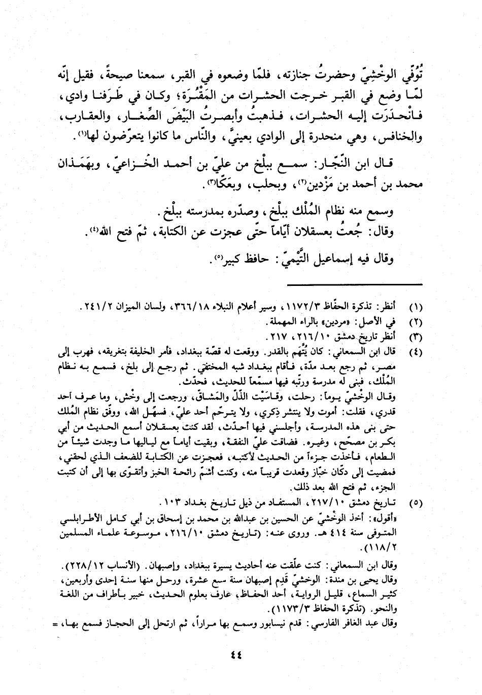 «أقول» : أخذ الوخشيّ عن الحسين بن عبد الله بن محمد بن إسحاق بن أبي كامل الأطرابلسي المتوفى سنة 414 هـ. وروى عنه: (تاريخ دمشق 10/ 216، موسوعة علماء المسلمين 2/ 118) .