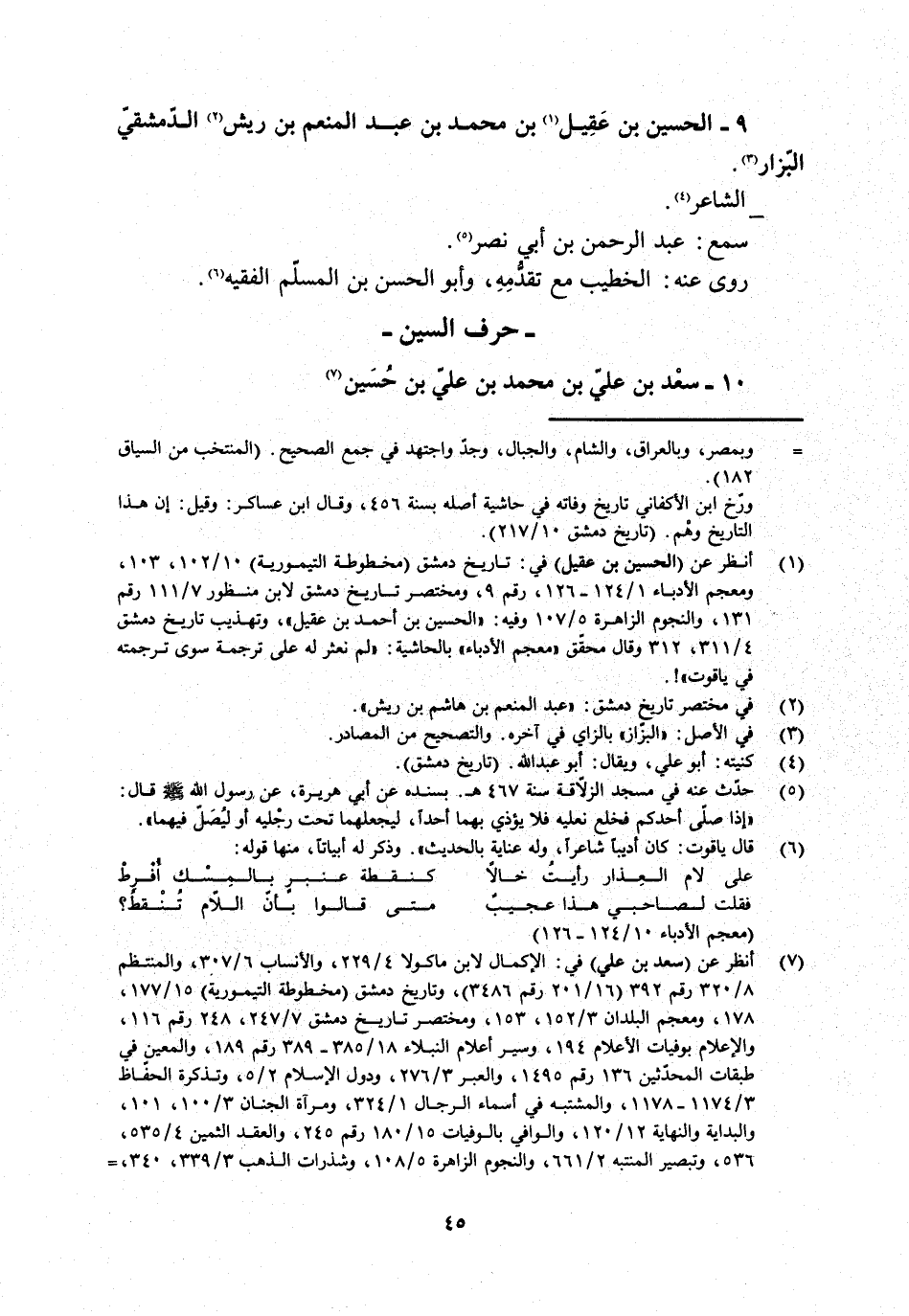 [1] انظر عن (الحسين بن عقيل) في: تاريخ دمشق (مخطوطة التيمورية) 10/ 102، 103، ومعجم الأدباء 1/ 124- 126، رقم 9، ومختصر تاريخ دمشق لابن منظور 7/ 111 رقم 131، والنجوم الزاهرة 5/ 107 وفيه: «الحسين بن أحمد بن عقيل» ، وتهذيب تاريخ دمشق 4/ 311، 312 وقال محقق «معجم الأدباء» بالحاشية: «لم نعثر له على ترجمة سوى ترجمته في ياقوت» !.