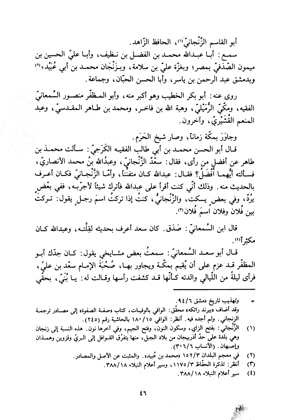 وقد أضاف «بيرند راتكه» محقّق: الوافي بالوفيات، كتاب «صفة الصفوة» إلى مصادر ترجمة الزنجاني. ولم أجده فيه. انظر: الوافي 15/ 180 بالحاشية رقم (245) .
