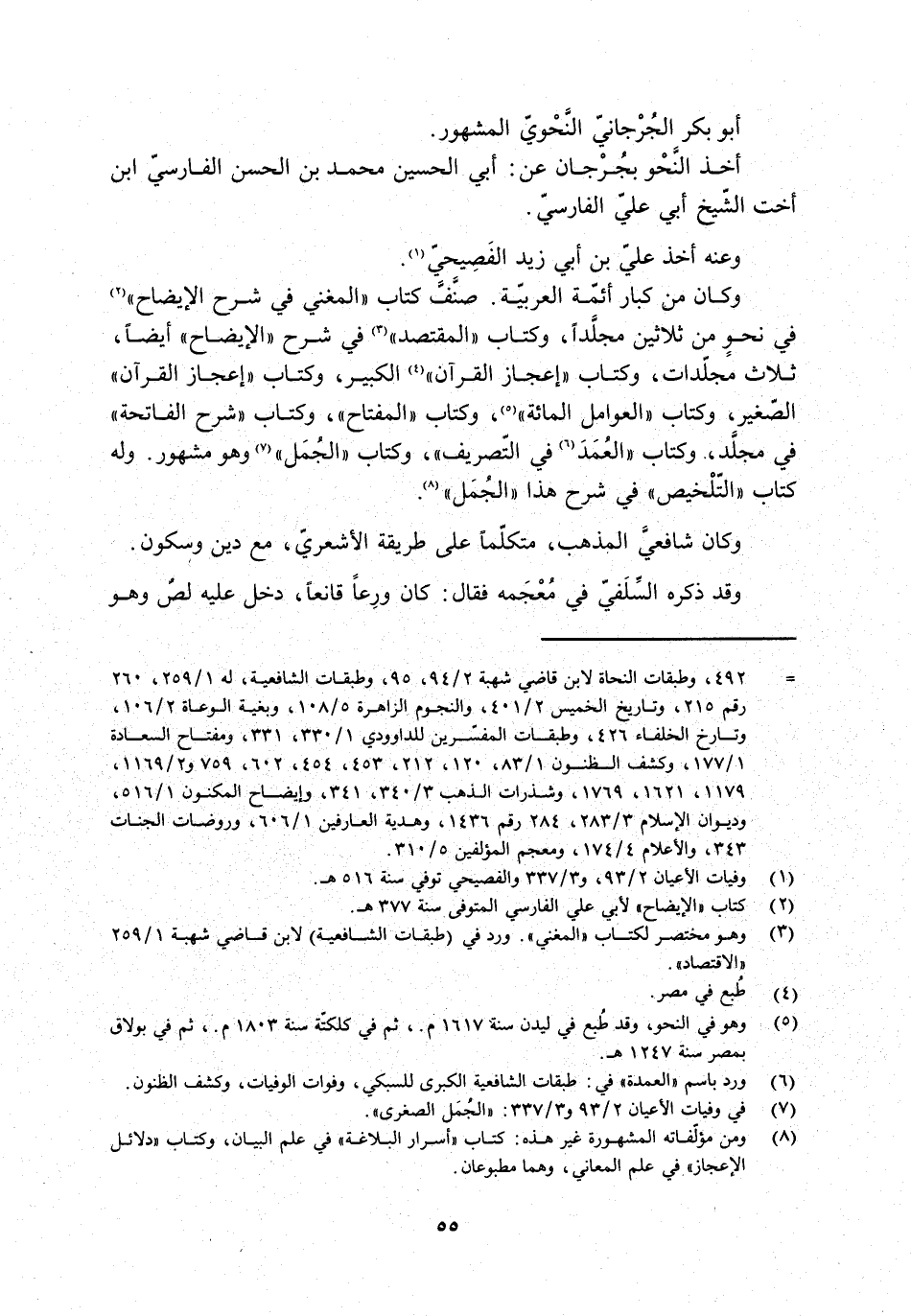 في نحوٍ من ثلاثين مجلَّدًا، وكتاب «المقتصد» [3] في شرح «الإيضاح» أيضًا، ثلاث مجلّدات، وكتاب «إعجاز القرآن» [4] الكبير، وكتاب «إعجاز القرآن» الصغير، وكتاب «العوامل المائة» [5] ، وكتاب «المفتاح» ، وكتاب «شرح الفاتحة» في مجلّد، وكتاب «العُمَد [6] في التّصريف» ، وكتاب «الْجُمَل» [7] وهو مشهور. وله كتاب «التّلْخيص» في شرح هذا «الْجُمَل» [8] .