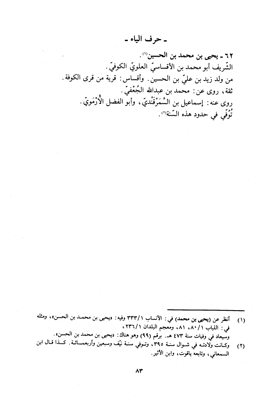 [1] انظر عن (يحيى بن محمد) في: الأنساب 1/ 333 وفيه: «يحيى بن محمد بن الحسن» ، ومثله في: اللباب 1/ 80، 81، ومعجم البلدان 1/ 236، وسيعاد في وفيات سنة 473 هـ. برقم (99) وهو هناك: «يحيى بن محمد بن الحسن» .