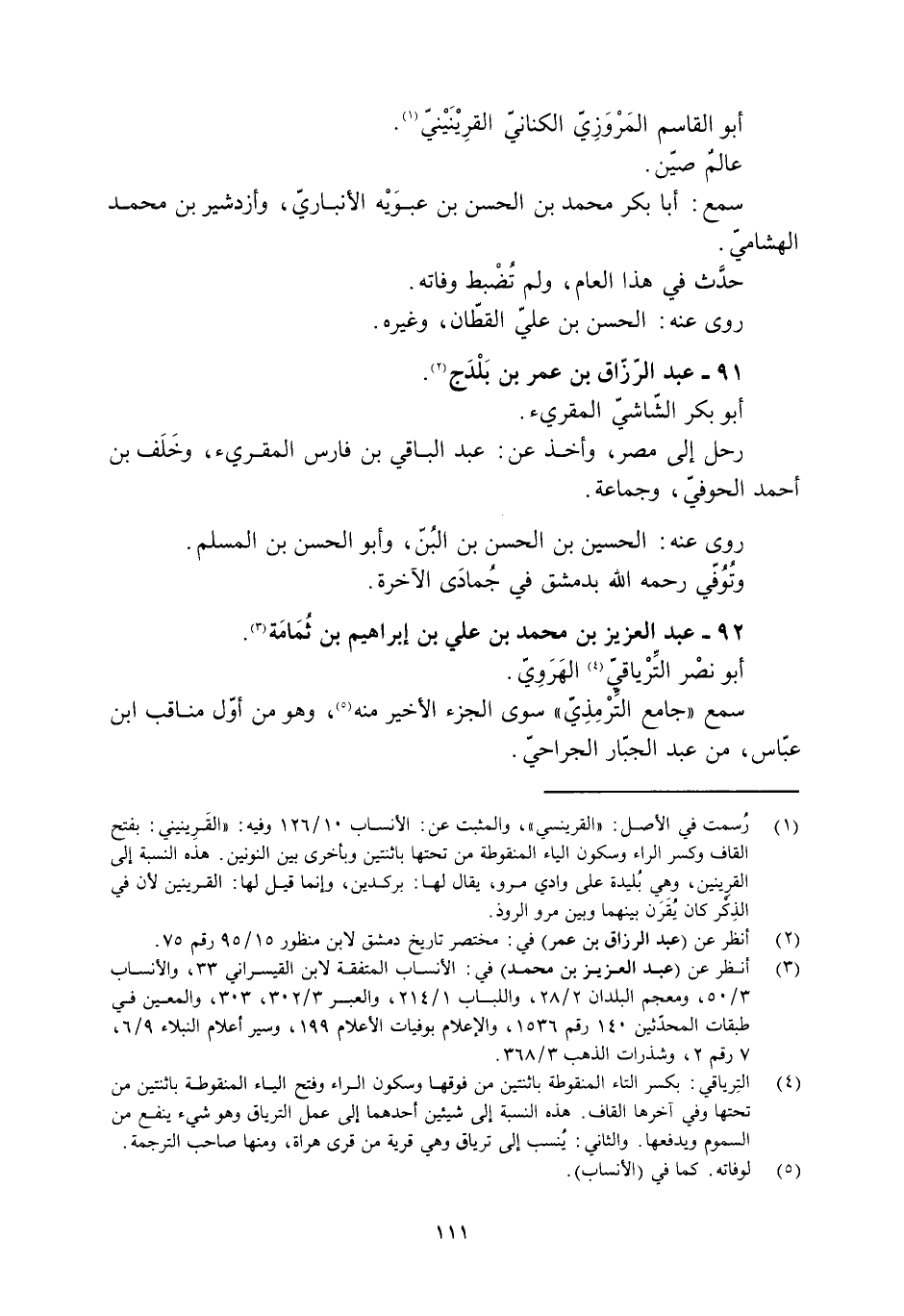 [1] رسمت في الأصل: «القرينسي» ، والمثبت عن: الأنساب 10/ 126 وفيه: «القرينيني: بفتح القاف وكسر الراء وسكون الياء المنقوطة من تحتها باثنتين وبأخرى بين النونين. هذه النسبة إلى القرينين، وهي بليدة على وادي مرو، يقال لها: بركدين، وإنما قيل لها: القرينين لأن في الذكر كان يقرن بينهما وبين مروالروذ.