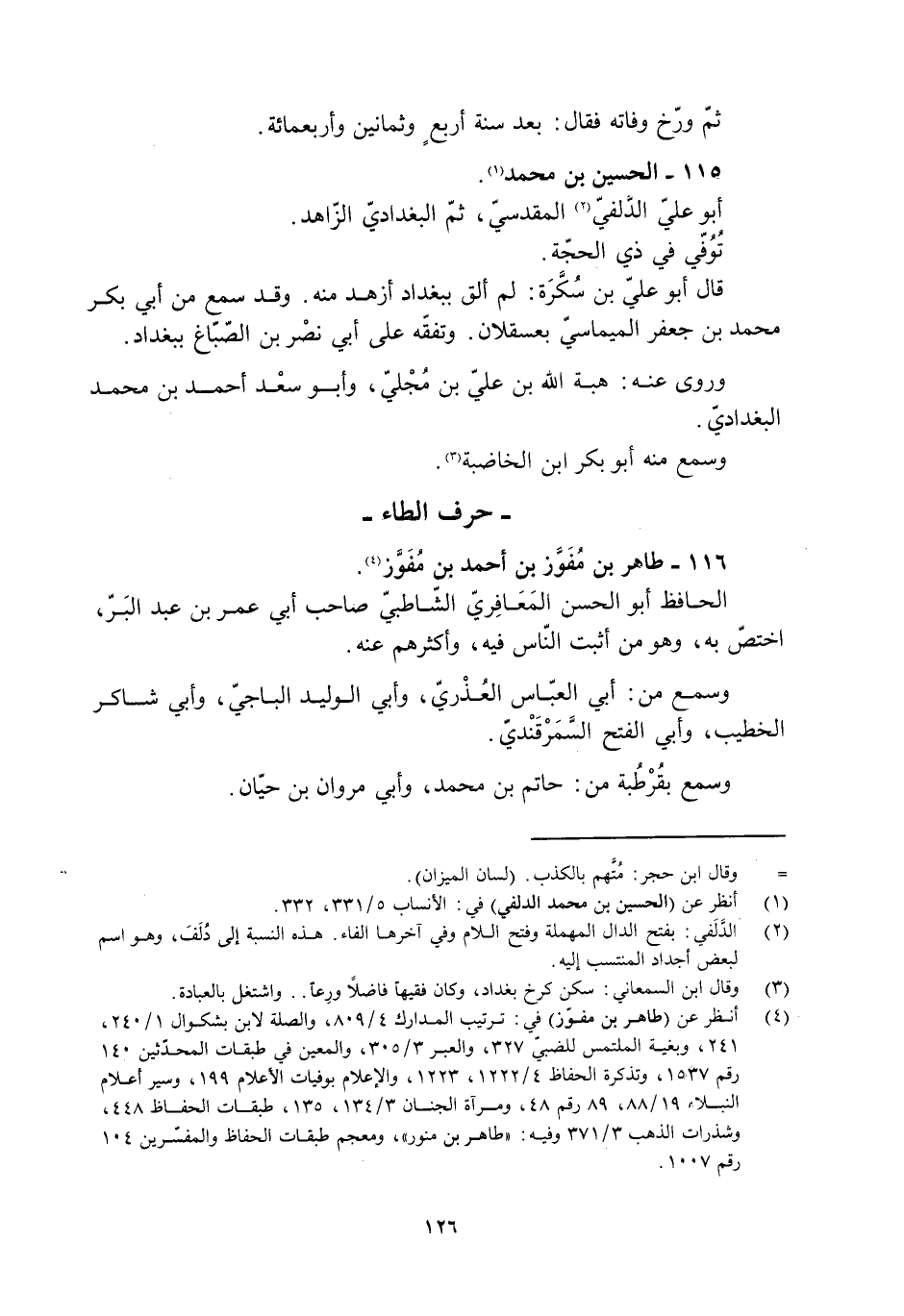[4] انظر عن (طاهر بن مفوّز) في: ترتيب المدارك 4/ 809، والصلة لابن بشكوال 1/ 240، 241، وبغية الملتمس للضبيّ 327، والعبر 3/ 305، والمعين في طبقات المحدّثين 140 رقم 1537، وتذكرة الحفاظ 4/ 1222، 1223، والإعلام بوفيات الأعلام 199، وسير أعلام النبلاء 19/ 88، 89 رقم 48، ومرآة الجنان 3/ 134، 135، طبقات الحفاظ 448، وشذرات الذهب 3/ 371 وفيه: «طاهر بن منور» ، ومعجم طبقات الحفاظ والمفسّرين 104 رقم 1007.