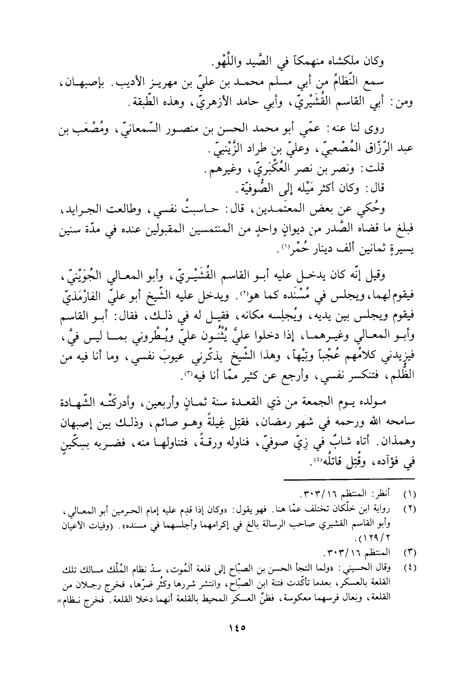[2] رواية ابن خلّكان تختلف عمّا هنا. فهو يقول: «وكان إذا قدم عليه إمام الحرمين أبو المعالي، وأبو القاسم القشيري صاحب الرسالة بالغ في إكرامهما وأجلسهما في مسندة» . (وفيات الأعيان 2/ 129) .