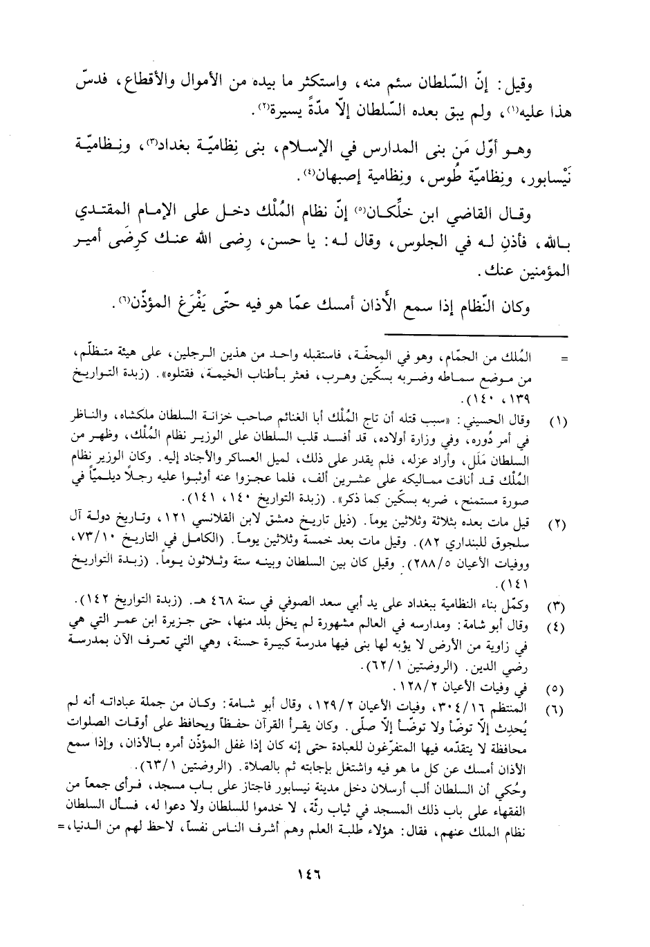 [2] قيل مات بعده بثلاثة وثلاثين يوما. (ذيل تاريخ دمشق لابن القلانسي 121، وتاريخ دولة آل سلجوق للبنداري 82) . وقيل مات بعد خمسة وثلاثين يوما. (الكامل في التاريخ 10/ 73، ووفيات الأعيان 5/ 288) . وقيل كان بين السلطان وبينه ستة وثلاثون يوما. (زبدة التواريخ 141) .