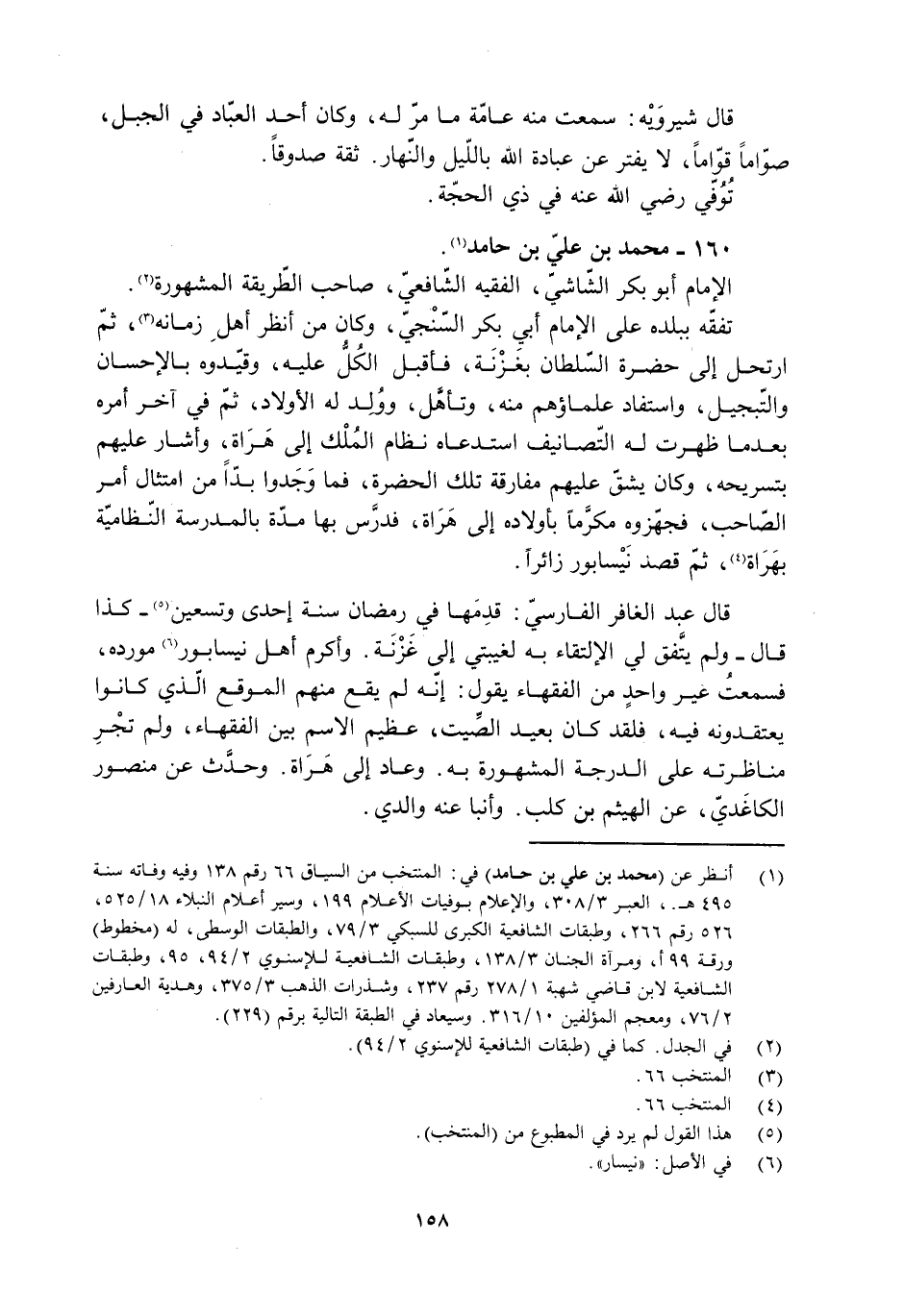 [1] انظر عن (محمد بن علي بن حامد) في: المنتخب من السياق 66 رقم 138 وفيه وفاته سنة 495 هـ.، العبر 3/ 308، والإعلام بوفيات الأعلام 199، وسير أعلام النبلاء 18/ 525، 526 رقم 266، وطبقات الشافعية الكبرى للسبكي 3/ 79، والطبقات الوسطى، له (مخطوط) ورقة 99 أ، ومرآة الجنان 3/ 138، وطبقات الشافعية للإسنويّ 2/ 94، 95، وطبقات الشافعية لابن قاضي شهبة 1/ 278 رقم 237، وشذرات الذهب 3/ 375، وهدية العارفين 2/ 76، ومعجم المؤلفين 10/ 316. وسيعاد في الطبقة التالية برقم (229) .