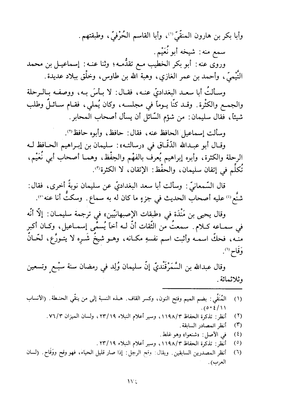 قال السّمعانيّ: وسألت أبا سعد البغداديْ عن سليمان نوبةً أخرى، فقال: