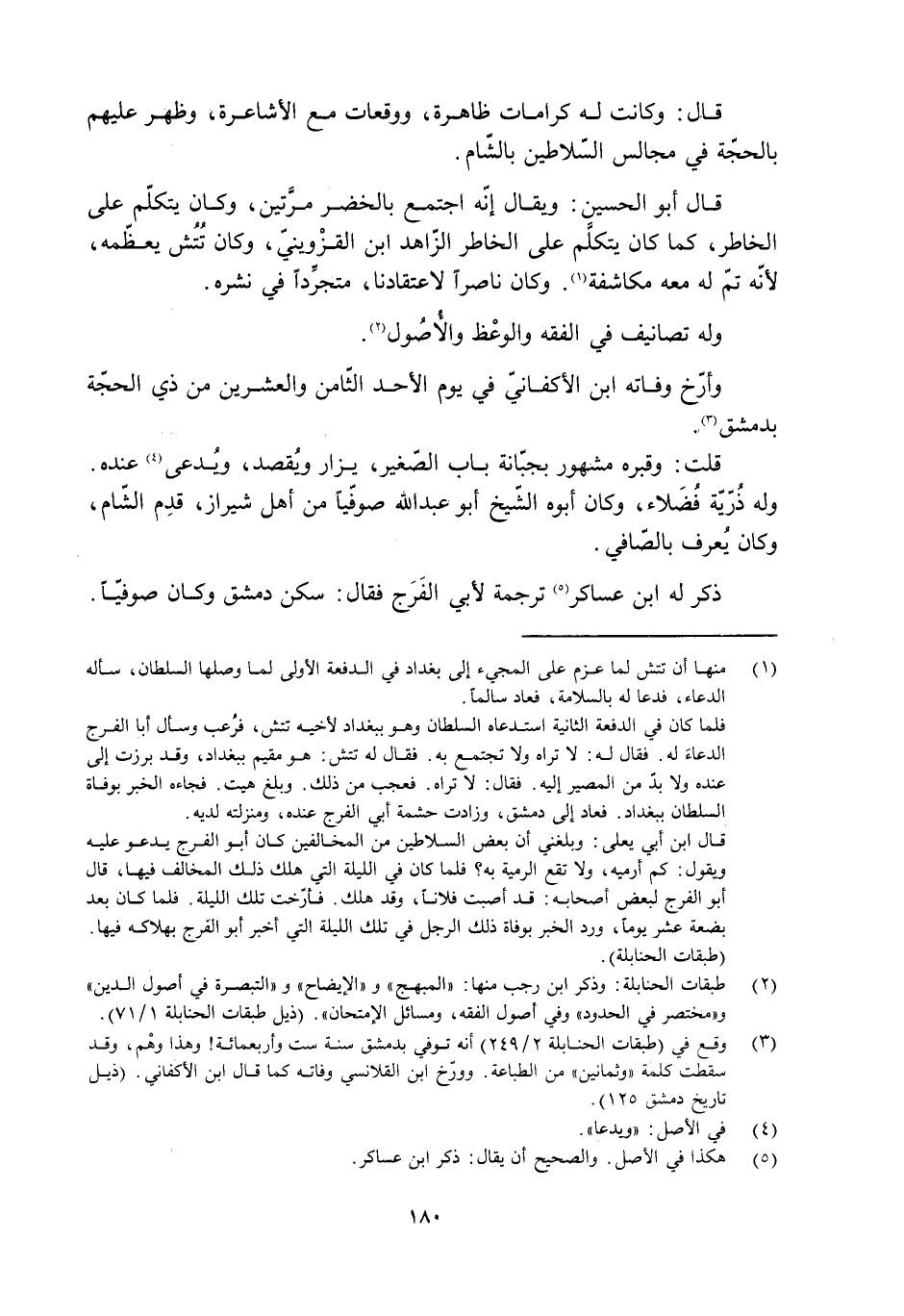 [3] وقع في (طبقات الحنابلة 2/ 249) أنه توفي بدمشق سنة ست وأربعمائة! وهذه وهم، وقد سقطت كلمة «وثمانين» من الطباعة. وورّخ ابن القلانسي وفاته كما قال ابن الأكفاني. (ذيل تاريخ دمشق 125) .